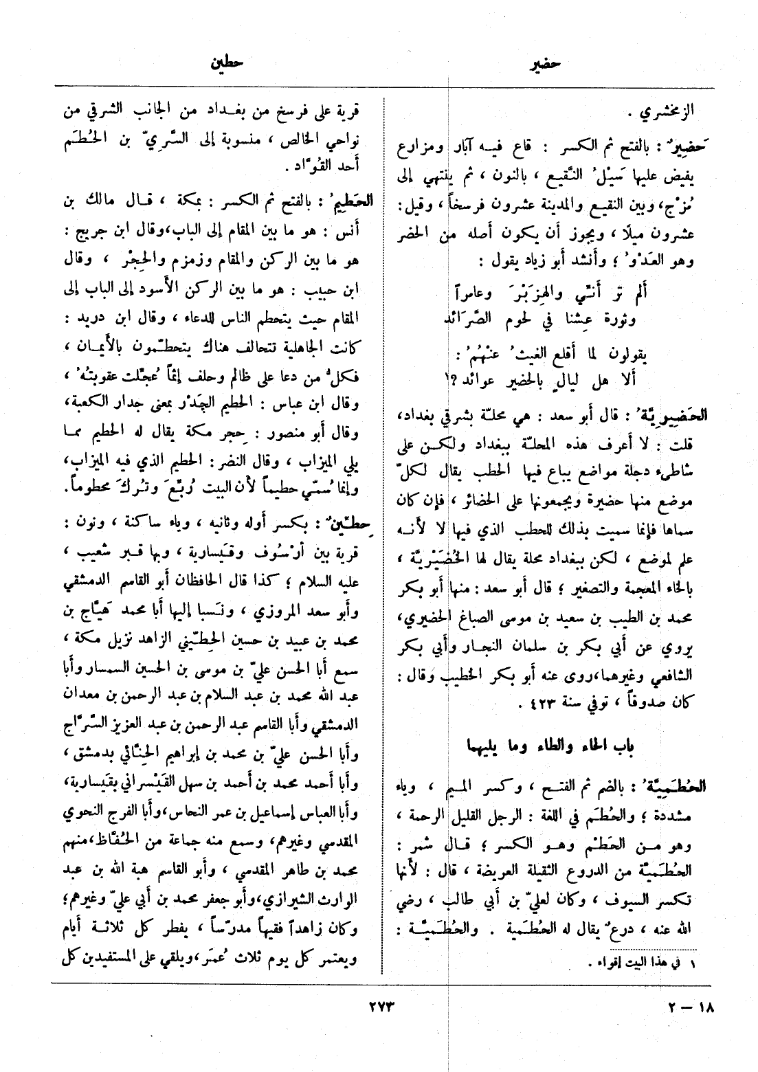 قال أبو سعد: هي محلّة بشرقي بغداد، قلت: لا أعرف هذه المحلّة ببغداد ولكن على شاطئ دجلة مواضع يباع فيها الحطب يقال لكلّ موضع منها حضيرة ويجمعونها على الحضائر، فإن كان سماها فإنما سميت بذلك للحطب الذي فيها لا لأنه علم لموضع، لكن ببغداد محلة يقال لها الخضيريّة، بالخاء المعجمة والتصغير، قال أبو سعد: منها أبو بكر محمد بن الطيب بن سعيد بن موسى الصباغ الحضيري، يروي عن أبي بكر بن سلمان النجار وأبي بكر الشافعي وغيرهما، روى عنه أبو بكر الخطيب وقال: