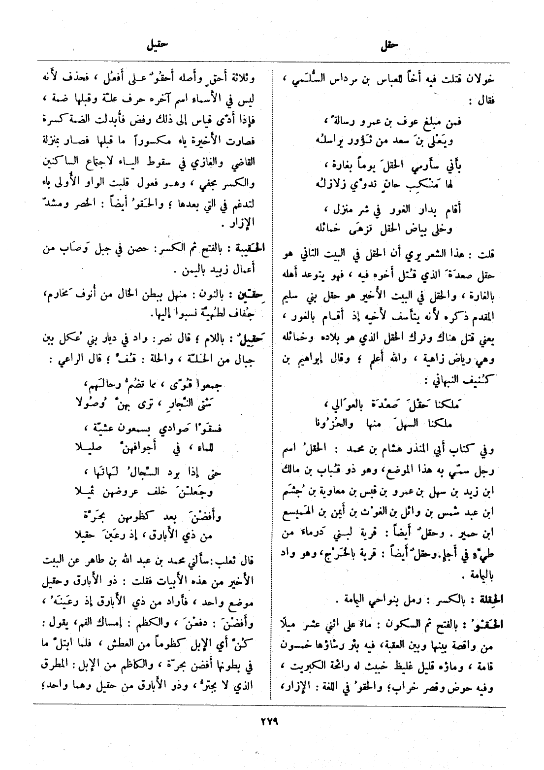 وفي كتاب أبي المنذر هشام بن محمد: الحقل اسم رجل سمّي به هذا الموضع، وهو ذو قباب بن مالك ابن زيد بن سهل بن عمرو بن قيس بن معاوية بن جشم ابن عبد شمس بن وائل بن الغوث بن أيمن بن الهميسع ابن حمير. وحقل أيضا: قرية لبني درماء من طيّء في أجإ. وحقل أيضا: قرية بالخرج، وهو واد باليمامة.
