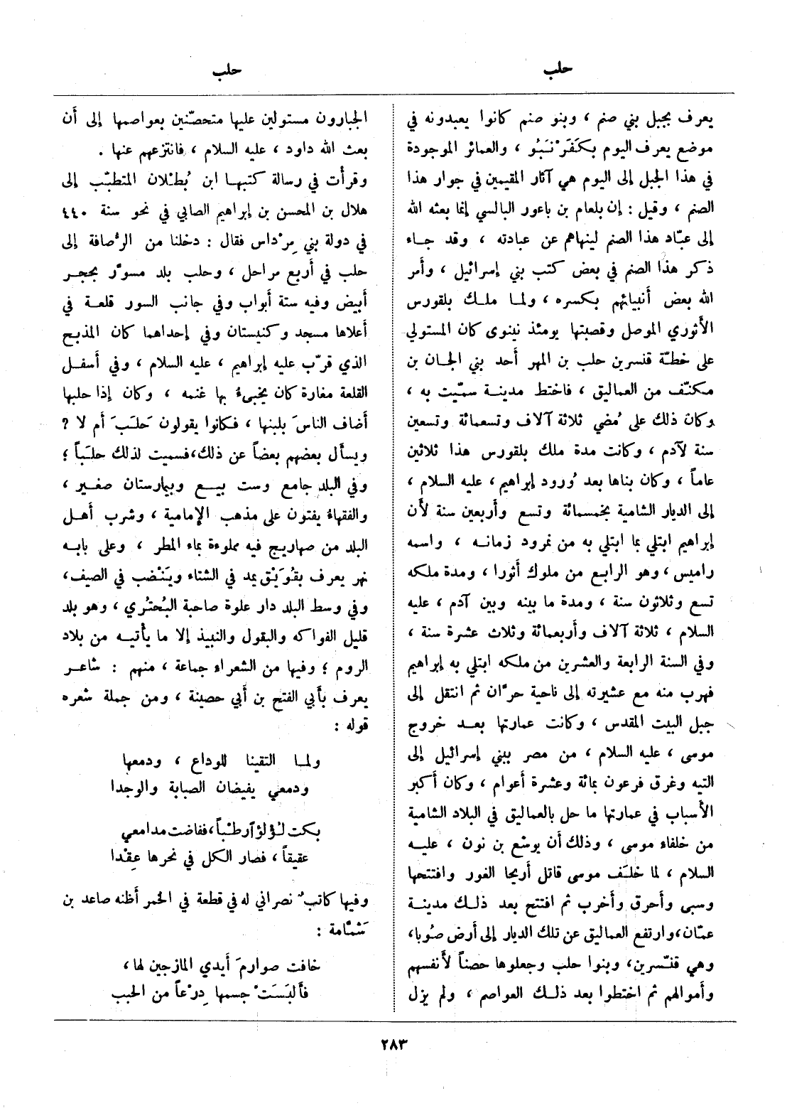 ويسأل بعضهم بعضا عن ذلك، فسميت لذلك حلبا، وفي البلد جامع وست بيع وبيمارستان صغير، والفقهاء يفتون على مذهب الإمامية، وشرب أهل البلد من صهاريج فيه مملوءة بماء المطر، وعلى بابه نهر يعرف بقويق يمد في الشتاء وينضب في الصيف، وفي وسط البلد دار علوة صاحبة البحتري، وهو بلد قليل الفواكه والبقول والنبيذ إلا ما يأتيه من بلاد الروم، وفيها من الشعراء جماعة، منهم: شاعر يعرف بأبي الفتح بن أبي حصينة، ومن جملة شعره قوله: