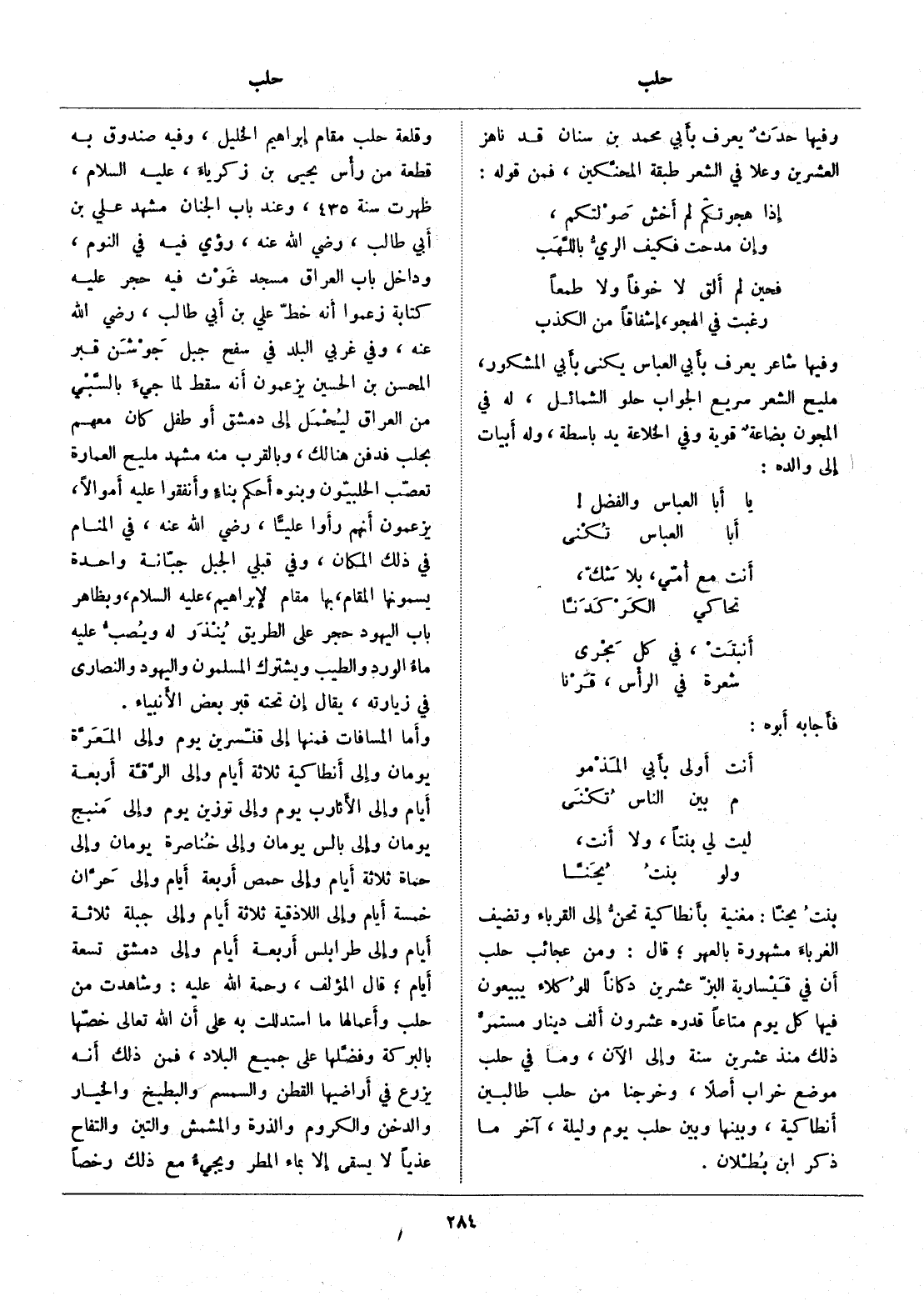 بنت يحنّا: مغنية بأنطاكية تحنّ إلى القرباء وتضيف الغرباء مشهورة بالعهر، قال: ومن عجائب حلب أن في قيسارية البزّ عشرين. دكانا للوكلاء يبيعون فيها كل يوم متاعا قدره عشرون ألف دينار مستمرّ ذلك منذ عشرين سنة وإلى الآن، وما في حلب موضع خراب أصلا، وخرجنا من حلب طالبين أنطاكية، وبينها وبين حلب يوم وليلة، آخر ما ذكر ابن بطلان.