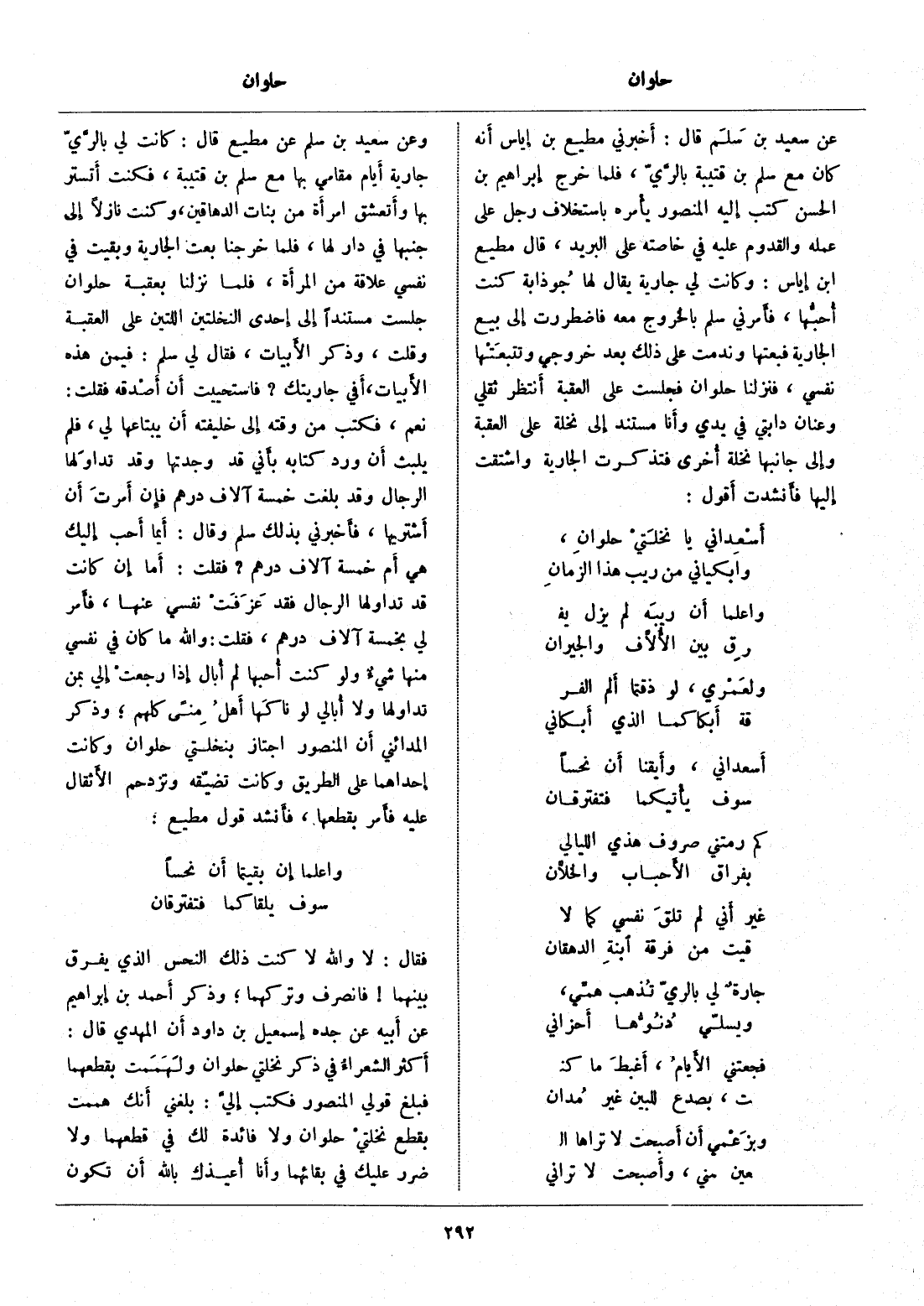 وعن سعيد بن سلم عن مطيع قال: كانت لي بالرّيّ، جارية أيام مقامي بها مع سلم بن قتيبة، فكنت أتستر بها وأتعشق امرأة من بنات الدهاقين، وكنت نازلا إلى جنبها في دار لها، فلما خرجنا بعت الجارية وبقيت في نفسي علاقة من المرأة، فلما نزلنا بعقبة حلوان جلست مستندا إلى إحدى النخلتين اللتين على العقبة وقلت، وذكر الأبيات، فقال لي سلم: فيمن هذه الأبيات، أفي جاريتك؟ فاستحييت أن أصدقه فقلت: