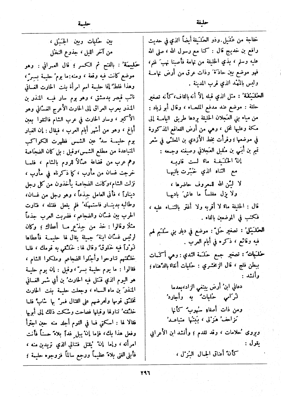 بالفتح ثم الكسر، قال العمراني: وهو موضع كانت فيه وقعة، ومنه: ما يوم حليمة بسرّ، وهذا غلط إنما حليمة اسم امرأة بنت الحارث الغساني نائب قيصر بدمشق، وهو يوم سار فيه المنذر بن المنذر بعرب العراق إلى الحارث الأعرج الغسّاني وهو الأكبر، وسار الحارث في عرب الشام فالتقوا بعين أباغ، وهو من أشهر أيام العرب، فيقال: إن الغبار يوم حليمة سدّ عين الشمس فظهرت الكواكب المتباعدة من مطلع الشمس، وقيل: بل كان الضجاعمة وهم عرب من قضاعة عمّالا للروم بالشام، فلما خرجت غسان من مأرب، كما ذكرناه في مأرب، نزلت الشام، وكانت الضجاعمة يأخذون من كل رجل دينارا، فأتى العامل جذعا، وهو رجل من غسان، وطالبه بدينار فاستمهله فلم يفعل فقتله، فثارت الحرب بين غسّان والضجاعم، فضربت العرب جذعا مثلا وقالوا: خذ من جذع ما أعطاك، وكان لرئيس غسّان ابنة جميلة يقال لها حليمة فأعطاها تورا فيه خلوق وقال لها: خلّقي به قومك، فلما خلّقتهم تناوحوا وأجلوا الضجاعم وملكوا الشام، فقالوا: ما يوم حليمة بسرّ، وقيل: إن يوم حليمة هو اليوم الذي قتل فيه الحارث بن أبي شمر الغساني المنذر بن ماء السماء، وجعلت حليمة بنت الحارث تخلّق قومها وتحرضهم على القتال فمرّ بها شابّ فلما خلّقته تناولها وقبلها فصاحت وشكت ذلك إلى أبويها فقالا لها: اسكتي فما في القوم أجلد منه حين اجترأ وفعل هذا بك، فإما إن يبل غدا بلاء حسنا فأنت امرأته، وإما إن يقتل فتنالي الذي تريدين منه، فأبلى الفتى بلاء عظيما ورجع سالما فزوجوه حليمة،
