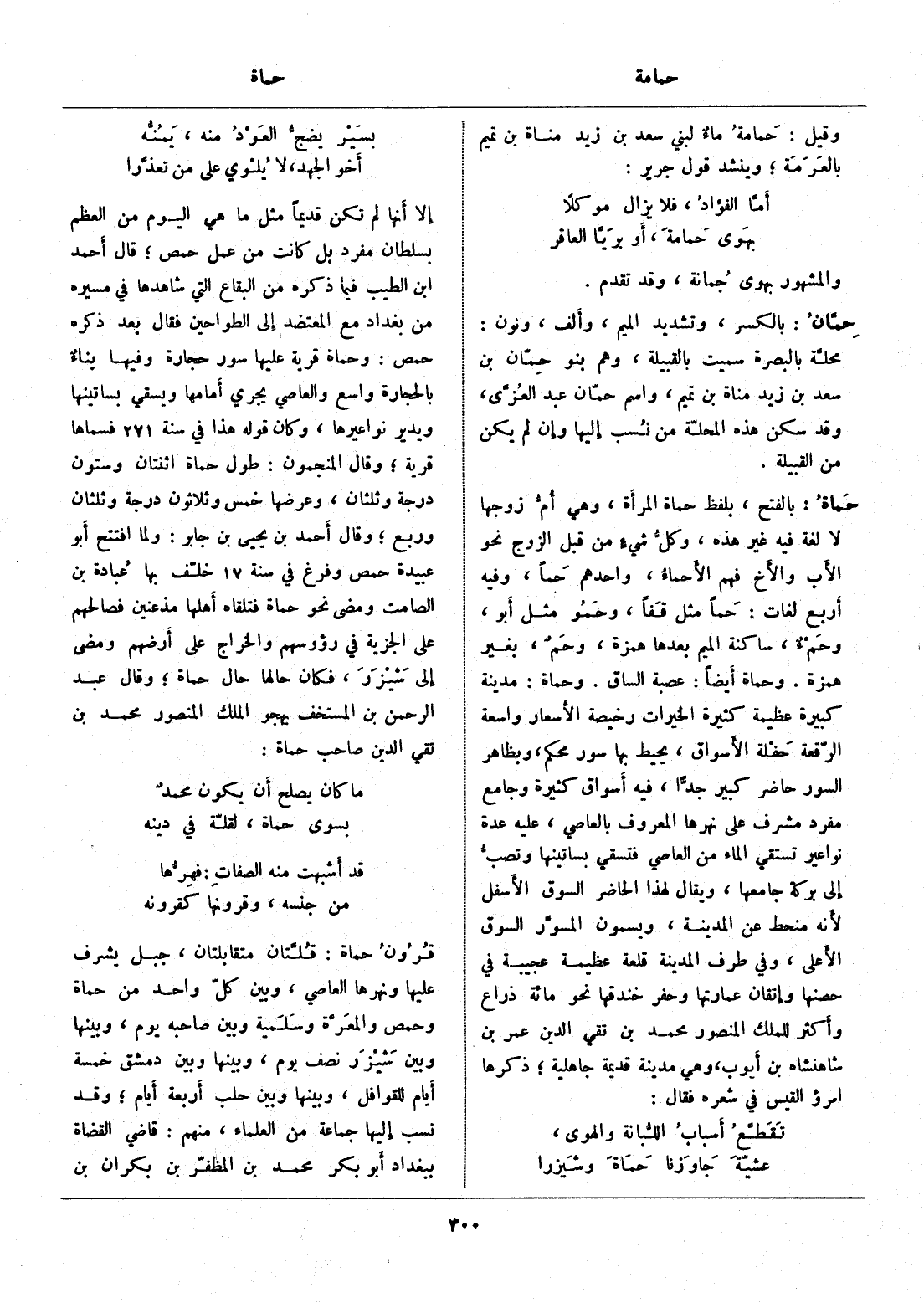 بالفتح، بلفظ حماة المرأة، وهي أمّ زوجها لا لغة فيه غير هذه، وكلّ شيء من قبل الزوج نحو الأب والأخ فهم الأحماء، واحدهم حما، وفيه أربع لغات: حما مثل قفا، وحمو مثل أبو، وحمء، ساكنة الميم بعدها همزة، وحم، بغير همزة. وحماة أيضا: عصبة الساق. وحماة: مدينة كبيرة عظيمة كثيرة الخيرات رخيصة الأسعار واسعة الرّقعة حفلة الأسواق، يحيط بها سور محكم، وبظاهر السور حاضر كبير جدّا، فيه أسواق كثيرة وجامع مفرد مشرف على نهرها المعروف بالعاصي، عليه عدة نواعير تستقي الماء من العاصي فتسقي بساتينها وتصبّ إلى بركة جامعها، ويقال لهذا الحاضر السوق الأسفل لأنه منحط عن المدينة، ويسمون المسوّر السوق الأعلى، وفي طرف المدينة قلعة عظيمة عجيبة في حصنها وإتقان عمارتها وحفر خندقها نحو مائة ذراع وأكثر للملك المنصور محمد بن تقي الدين عمر بن شاهنشاه بن أيوب، وهي مدينة قديمة جاهلية، ذكرها امرؤ القيس في شعره فقال: