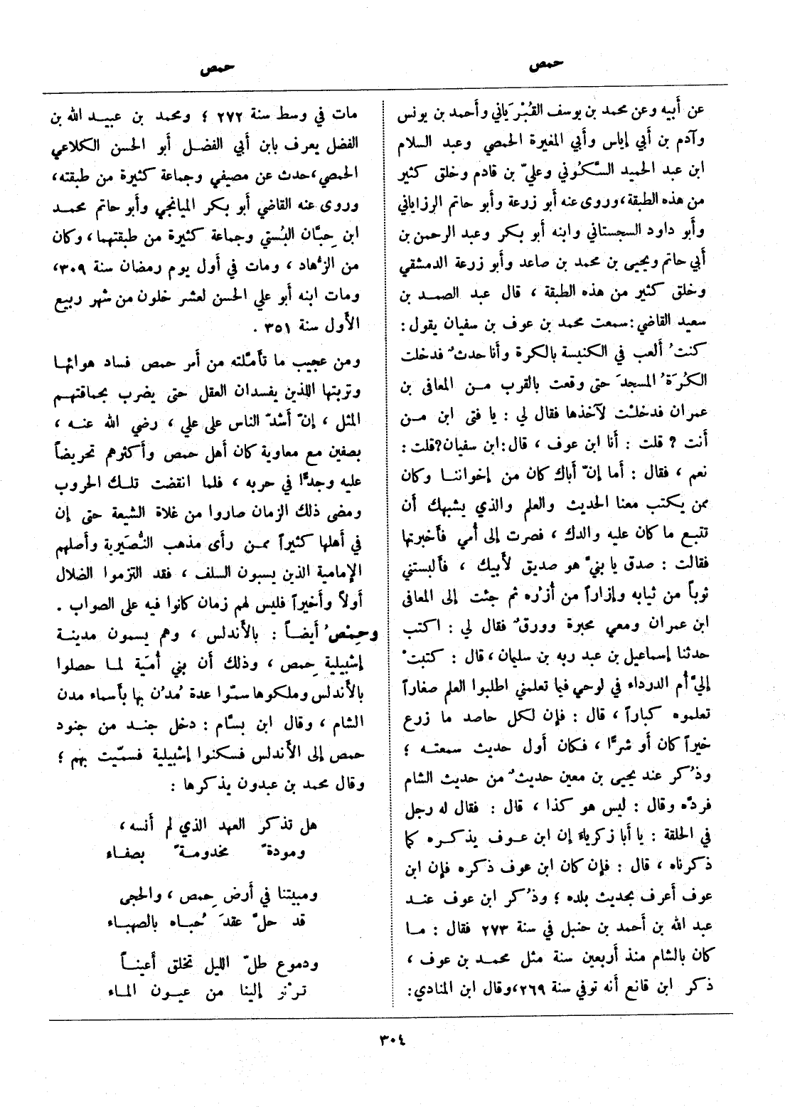 ومن عجيب ما تأمّلته من أمر حمص فساد هوائها وتربتها اللذين يفسدان العقل حتى يضرب بحماقتهم المثل، إنّ أشدّ الناس على علي، رضي الله عنه، بصفين مع معاوية كان أهل حمص وأكثرهم تحريضا عليه وجدّا في حربه، فلما انقضت تلك الحروب ومضى ذلك الزمان صاروا من غلاة الشيعة حتى إن في أهلها كثيرا ممن رأى مذهب النّصيرية وأصلهم الإمامية الذين يسبون السلف، فقد التزموا الضلال أولا وأخيرا فليس لهم زمان كانوا فيه على الصواب.