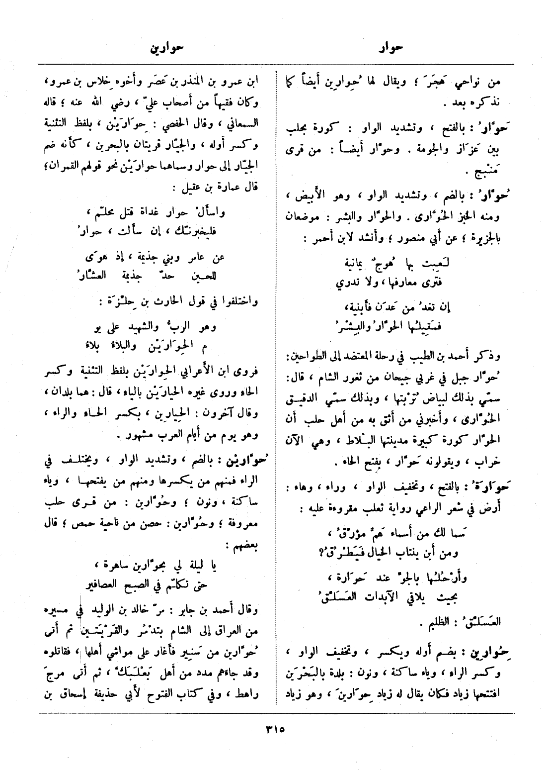 فروى ابن الأعرابي الحوارين بلفظ التثنية وكسر الحاء وروى غيره الحيارين بالياء، قال: هما بلدان، وقال آخرون: الحيارين، بكسر الحاء والراء، وهو يوم من أيام العرب مشهور.