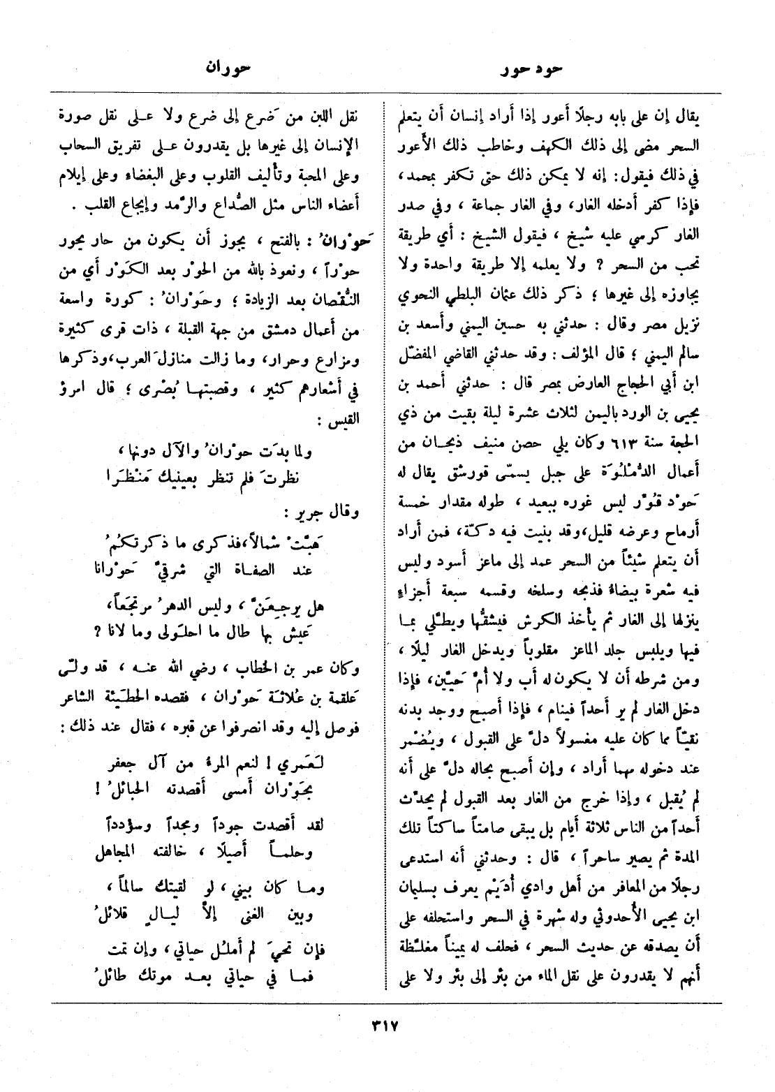 بالفتح، يجوز أن يكون من حار يحور حررا، ونعوذ بالله من الحور بعد الكور أي من النّقصان بعد الزيادة، وحوران: كورة واسعة من أعمال دمشق من جهة القبلة، ذات قرى كثيرة ومزارع وحرار، وما زالت منازل العرب، وذكرها في أشعارهم كثير، وقصبتها بصرى، قال امرؤ القيس: