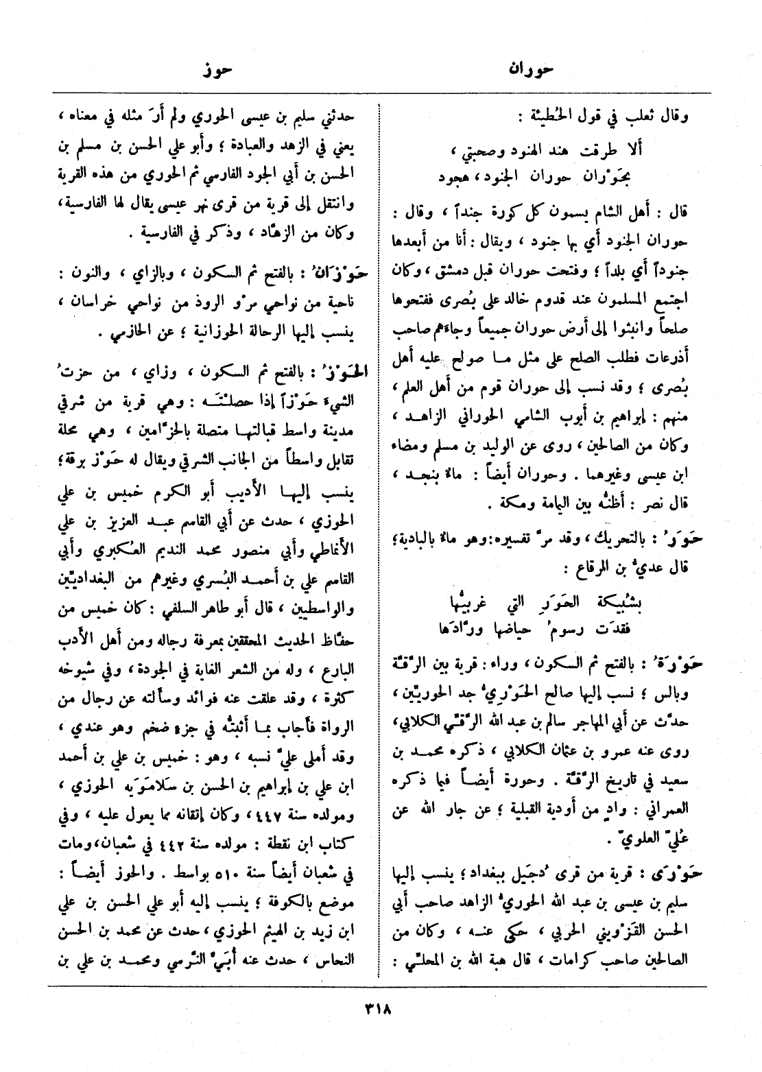 حوران الجنود أي بها جنود، ويقال: أنا من أبعدها جنودا أي بلدا، وفتحت حوران قبل دمشق، وكان اجتمع المسلمون عند قدوم خالد على بصرى ففتحوها صلحا وانبثوا إلى أرض حوران جميعا وجاءهم صاحب أذرعات فطلب الصلح على مثل ما صولح عليه أهل بصرى، وقد نسب إلى حوران قوم من أهل العلم، منهم: إبراهيم بن أيوب الشامي الحوراني الزاهد، وكان من الصالحين، روى عن الوليد بن مسلم ومضاء ابن عيسى وغيرهما. وحوران أيضا: ماء بنجد، قال نصر: أظنّه بين اليمامة ومكة.