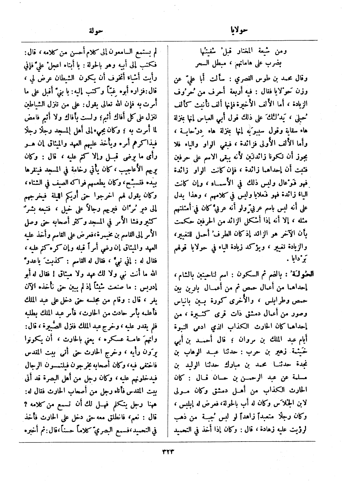 بالضم ثم السكون: اسم لناحيتين بالشام، إحداهما من أعمال حمص ثم من أعمال بارين بين حمص وطرابلس، والأخرى كورة بين بانياس وصور من أعمال دمشق ذات قرى كثيرة، من إحداهما كان الحارث الكذاب الذي ادعى النبوة أيام عبد الملك بن مروان، قال أحمد بن أبي خيثمة زهير بن حرب: حدثنا عبد الوهاب بن نجدة حدثنا محمد بن مبارك حدثنا الوليد بن مسلمة عن عبد الرحمن بن حسان قال: كان الحارث الكذاب من أهل دمشق وكان مولى لابن الجلاس وكان له أب بالحولة، فعرض له إبليس، وكان رجلا متعبدا زاهدا لو لبس جبة من ذهب لرأيت عليه زهادة، قال: وكان إذا أخذ في التحميد لم يستمع السامعون إلى كلام أحسن من كلامه، قال: