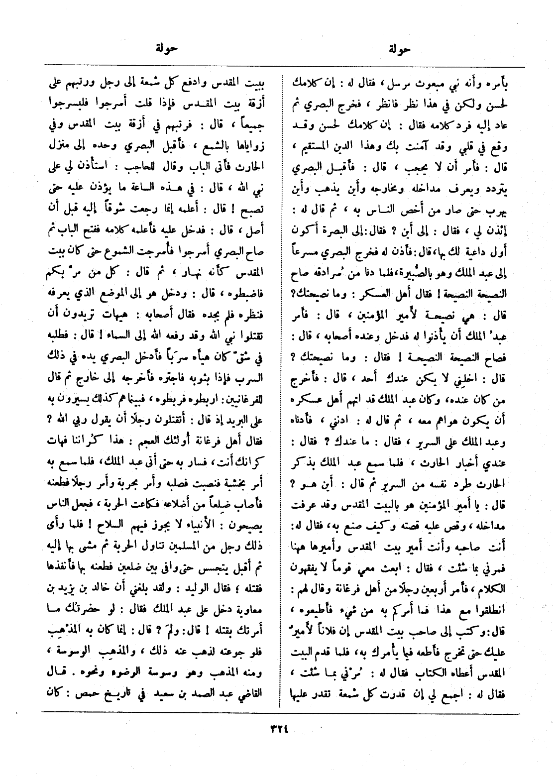 انطلقوا مع هذا فما أمركم به من شيء فأطيعوه، قال: وكتب إلى صاحب بيت المقدس إن فلانا لأمير عليك حتى تخرج فأطعه فيما يأمرك به، فلما قدم البيت المقدس أعطاه الكتاب فقال له: مرني بما شئت، فقال له: اجمع لي إن قدرت كل شمعة تقدر عليها ببيت المقدس وادفع كل شمعة إلى رجل ورتبهم على أزقة بيت المقدس فإذا قلت أسرجوا فليسرجوا جميعا، قال: فرتبهم في أزقة بيت المقدس وفي زواياها بالشمع، فأقبل البصري وحده إلى منزل الحارث فأتى الباب وقال للحاجب: استأذن لي على نبي الله، قال: في هذه الساعة ما يؤذن عليه حتى تصبح! قال: أعلمه إنما رجعت شوقا إليه قبل أن أصل، قال: فدخل عليه فأعلمه كلامه ففتح الباب ثم صاح البصري أسرجوا فأسرجت الشموع حتى كان بيت المقدس كأنه نهار، ثم قال: كل من مرّ بكم فاضبطوه، قال: ودخل هو إلى الموضع الذي يعرفه فنظره فلم يجده فقال أصحابه: هيهات تريدون أن تقتلوا نبي الله وقد رفعه الله إلى السماء! قال: فطلبه في شقّ كان هيأه سربا فأدخل البصري يده في ذلك السرب فإذا بثوبه فاجتره فأخرجه إلى خارج ثم قال للفرغانيين: اربطوه فربطوه، فبينما هم كذلك يسيرون به على البريد إذ قال: أتقتلون رجلا أن يقول ربي الله؟