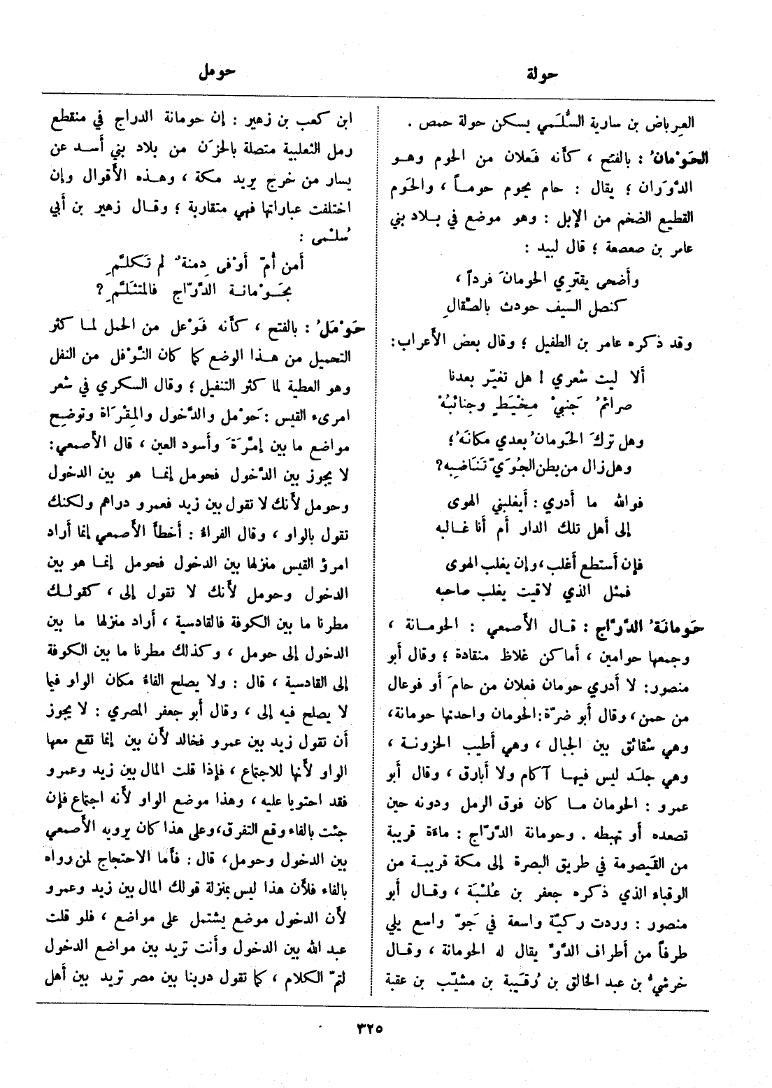 قال الأصمعي: الحومانة، وجمعها حوامين، أماكن غلاظ منقادة، وقال أبو منصور: لا أدري حومان فعلان من حام أو فوعال من حمن، وقال أبو ضرّة: الحومان واحدتها حومانة، وهي شقائق بين الجبال، وهي أطيب الحزونة، وهي جلد ليس فيها آكام ولا أبارق، وقال أبو عمرو: الحومان ما كان فوق الرمل ودونه حين تصعده أو تهبطه. وحومانة الدّرّاج: ماءة قريبة من القيصومة في طريق البصرة إلى مكة قريبة من الوقباء الذي ذكره جعفر بن علبة، وقال أبو منصور: وردت ركيّة واسعة في جوّ واسع يلي طرفا من أطراف الدّوّ يقال له الحومانة، وقال خرشيّ بن عبد الخالق بن رقيبة بن مشيّب بن عقبة ابن كعب بن زهير: إن حومانة الدراج في منقطع رمل الثعلبية متصلة بالحزن من بلاد بني أسد عن يسار من خرج يريد مكة، وهذه الأقوال وإن اختلفت عباراتها فهي متقاربة، وقال زهير بن أبي سلمى: