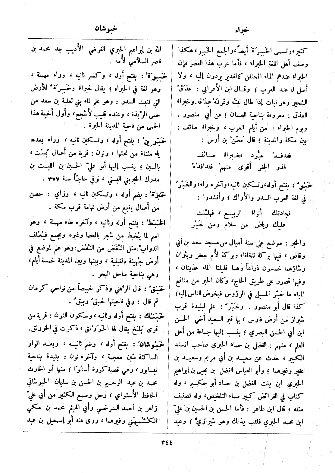 والخبر: موضع على ستة أميال من مسجد سعد بن أبي وقاص، فيها بركة للخلفاء وبركة لأم جعفر وبئران رشاؤهما خمسون ذراعا وهما قليلتا الماء عذبتان، وفيها قصور على طريق الحاج، وكان الخبر من مناقع المياه ما خبّر المسيل في الرؤوس فيخوض الناس إليه، كذا قال أبو منصور. وخبر: علم لبليدة قرب شيراز من أرض فارس، بها قبر السعيد أخي الحسن ابن أبي الحسن البصري، ينسب إليها جماعة من أهل العلم، منهم: الفضل بن حماد الخبري صاحب المسند الكبير، حدث عن سعيد بن أبي مريم وسعيد بن عفير وغيرهما، وأبو العباس الفضل بن يحيى بن إبراهيم الخبري ابن بنت الفضل بن حماد أبو حكيم، وله كتاب في الفرائض كبير سماه التلخيص، وله تصنيف مثله، قال ابن طاهر: فأما الحسن بن الحسين بن عليّ ابن محمد الخبري فلقب بذلك وهو شيرازيّ، وعبد الله بن إبراهيم الخبري الفرضي الأديب جد محمد بن ناصر السلّامي لأمه.