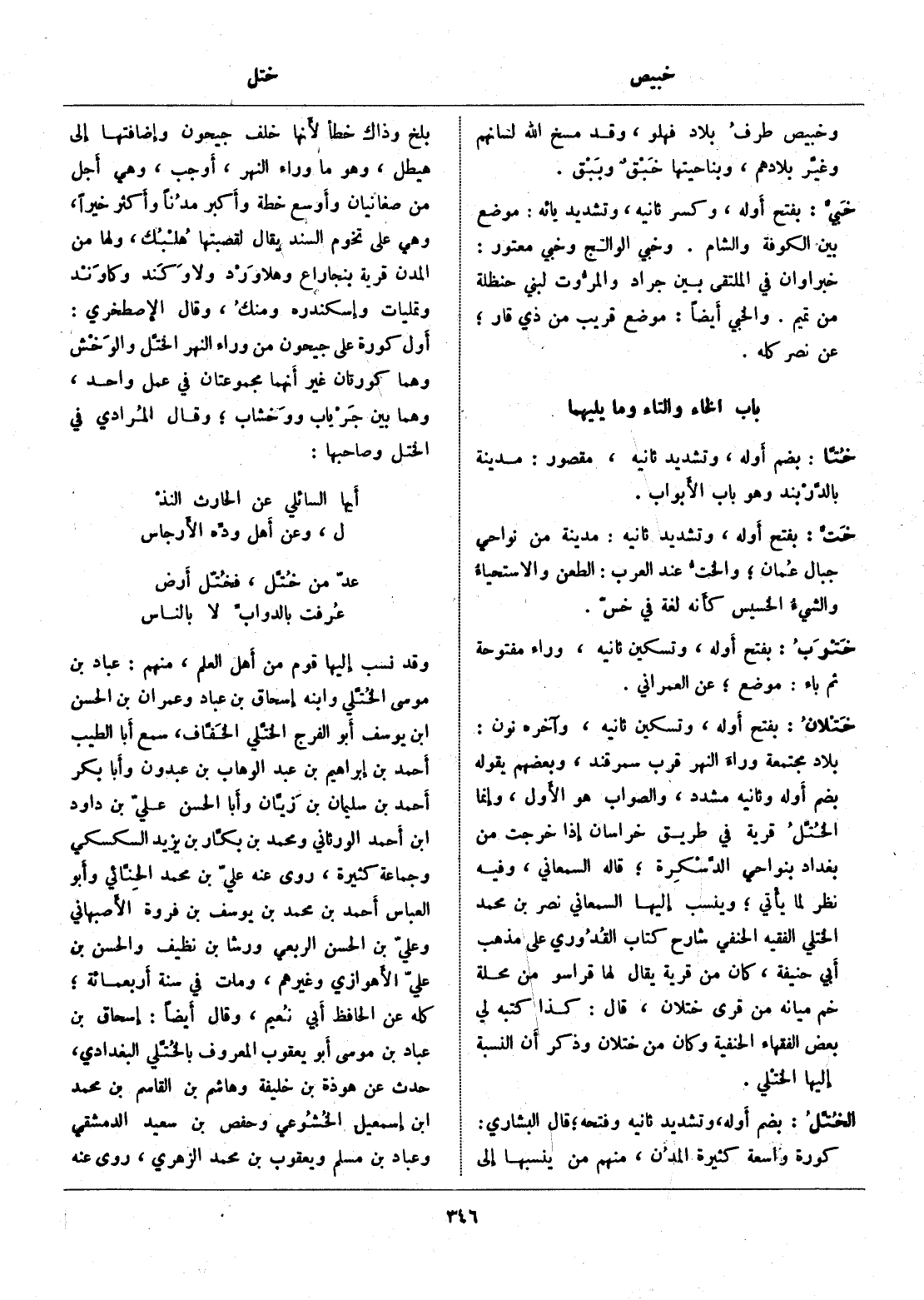 بلاد مجتمعة وراء النهر قرب سمرقند، وبعضهم يقوله بضم أوله وثانيه مشدد، والصواب هو الأول، وإنما الختّل قرية في طريق خراسان إذا خرجت من بغداد بنواحي الدّسكرة قاله السمعاني، وفيه نظر لما يأتي وينسب إليها السمعاني نصر بن محمد الختلي الفقيه الحنفي شارح كتاب القدوري على مذهب أبي حنيفة، كان من قرية يقال لها قراسو من محلة خم ميانه من قرى ختلان، قال: كذا كتبه لي بعض الفقهاء الحنفية وكان من ختلان وذكر أن النسبة إليها الختلي.