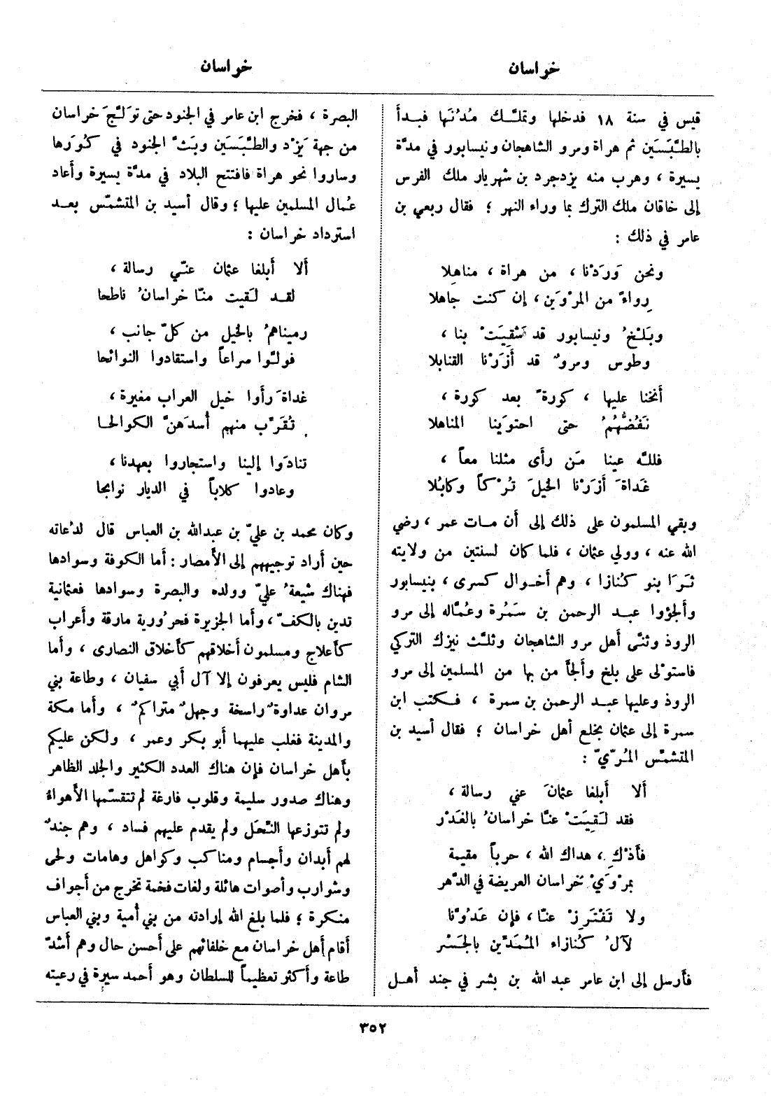فأرسل إلى ابن عامر عبد الله بن بشر في جند أهل البصرة، فخرج ابن عامر في الجنود حتى تولّج خراسان من جهة يزد والطّبسين وبثّ الجنود في كورها وساروا نحو هراة فافتتح البلاد في مدّة يسيرة وأعاد عمال المسلمين عليها، وقال أسيد بن المتشمّس بعد استرداد خراسان: