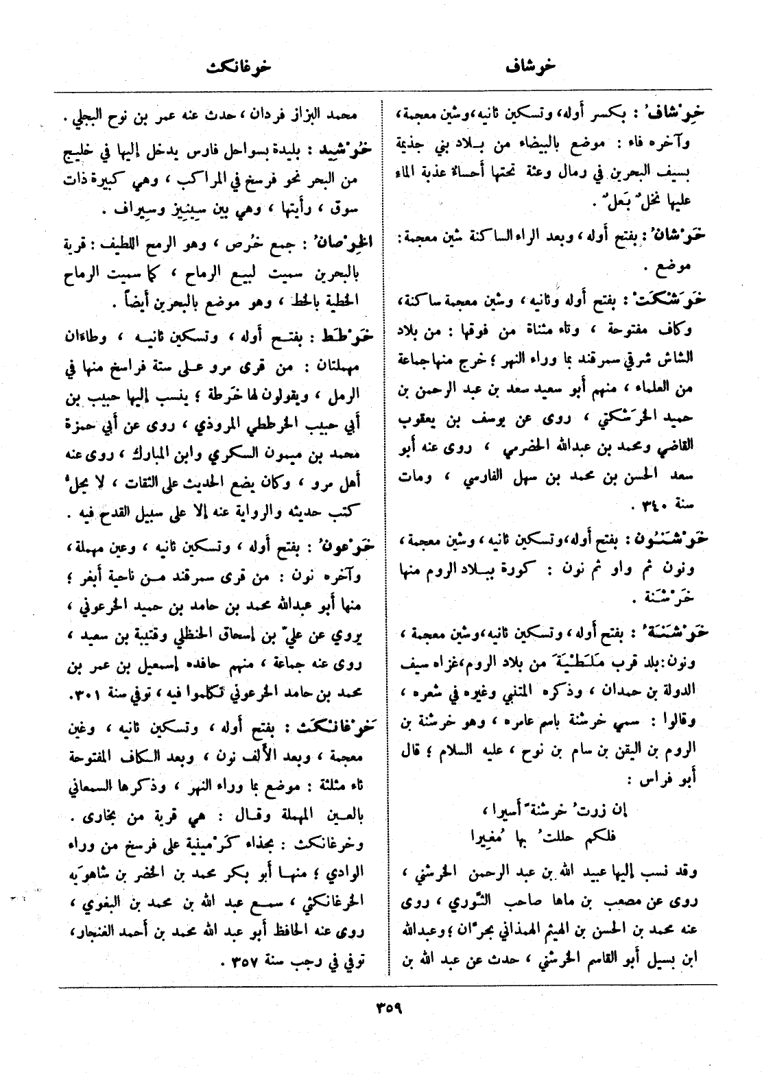 بفتح أوله وثانيه، وشين معجمة ساكنة، وكاف مفتوحة، وتاء مثناة من فوقها: من بلاد الشاش شرقي سمرقند بما وراء النهر، خرج منها جماعة من العلماء، منهم أبو سعيد سعد بن عبد الرحمن بن حميد الخرشكتي، روى عن يوسف بن يعقوب القاضي ومحمد بن عبد الله الحضرمي، روى عنه أبو سعد الحسن بن محمد بن سهل الفارسي، ومات سنة 340.