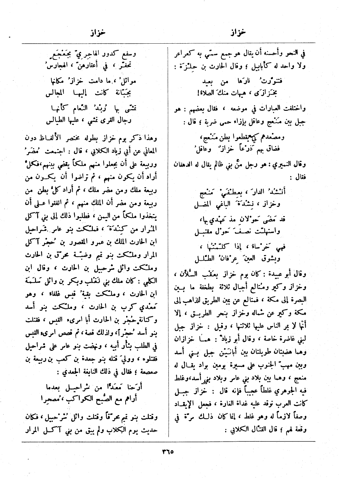 وقال أبو عبيدة: كان يوم خزاز بعقب السّلّان، وخزاز وكير ومتالع أجبال ثلاثة بطخفة ما بين البصرة إلى مكة، فمتالع عن يمين الطريق للذاهب إلى مكة وكير عن شماله وخزاز بنحر الطريق، إلا أنها لا يمر الناس عليها ثلاثتها، وقيل: خزاز جبل لبني غاضرة خاصة، وقال أبو زياد: هما خزازان وهما هضبتان طويلتان بين أبانين جبل بني أسد وبين مهبّ الجنوب على مسيرة يومين بواد يقال له منعج، وهما بين بلاد بني عامر وبلاد بني أسد، وغلط فيه الجوهري غلطا عجيبا فإنه قال: خزاز جبل كانت العرب توقد عليه غداة الغارة، فجعل الإيقاد وصفا لازما له وهو غلط، إنما كان ذلك مرّة في وقعة لهم، قال القتّال الكلابي:
