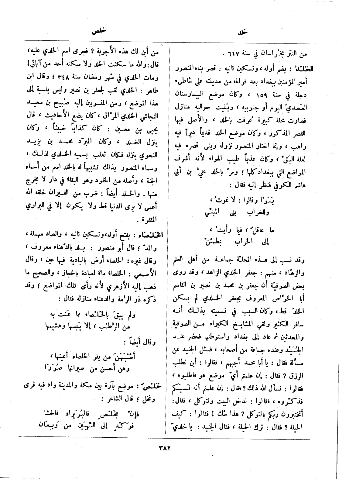 أتختبرون ربكم بالتوكل؟ هذا شك! فقالوا: كيف الحيلة؟ فقال: ترك الحيلة، فقال الجنيد: يا خلديّ من أين لك هذه الأجوبة؟ فجرى اسم الخلدي عليه، قال: والله ما سكنت الخلد ولا سكنه أحد من آبائي! ومات الخلدي في شهر رمضان سنة 348، وقال ابن طاهر: الخلدي لقب لجعفر بن نصير وليس بنسبة إلى هذا الموضع، ومن المنسوبين إليه صبيح بن سعيد النجاشي الخلدي المرّاق، كان يضع الأحاديث، قال يحيى بن معين: كان كذابا خبيثا، وكان ينزل الخلد، وكان المبرّد محمد بن يزيد النحوي ينزله فكان ثعلب يسميه الخلدي لذلك، وسماه المنصور بذلك تشبيها له بالخلد اسم من أسماء الجنة، وأصله من الخلود وهو البقاء في دار لا يخرج منها. والخلد أيضا: ضرب من الفيران خلقه الله أعمى لا يرى الدنيا قط ولا يكون إلا في البراري المقفرة.