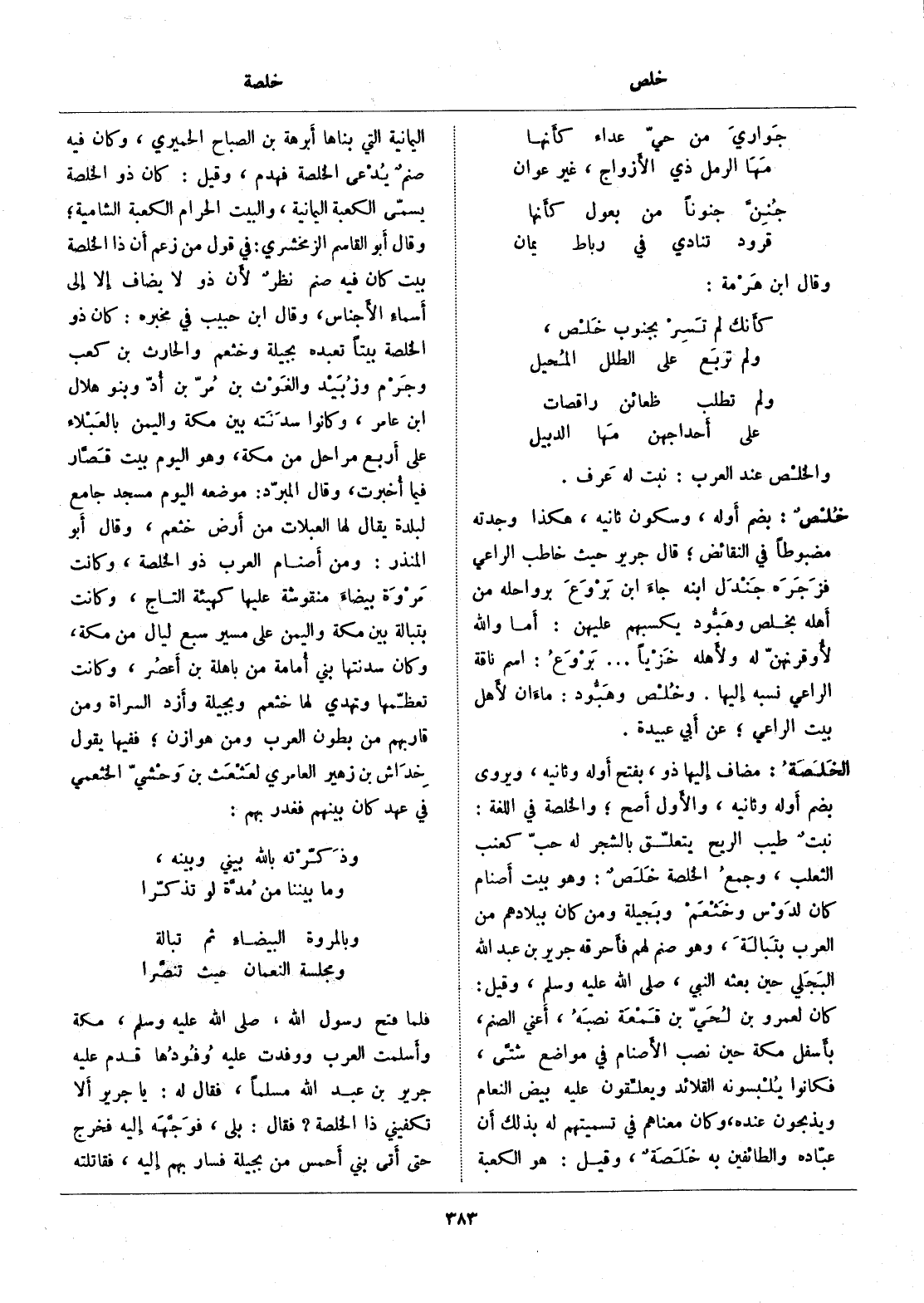نبت طيب الريح يتعلّق بالشجر له حبّ كعنب الثعلب، وجمع الخلصة خلص: وهو بيت أصنام كان لدوس وخثعم وبجيلة ومن كان ببلادهم من العرب بتبالة، وهو صنم لهم فأحرقه جرير بن عبد الله البجلي حين بعثه النبي، صلى الله عليه وسلم، وقيل: