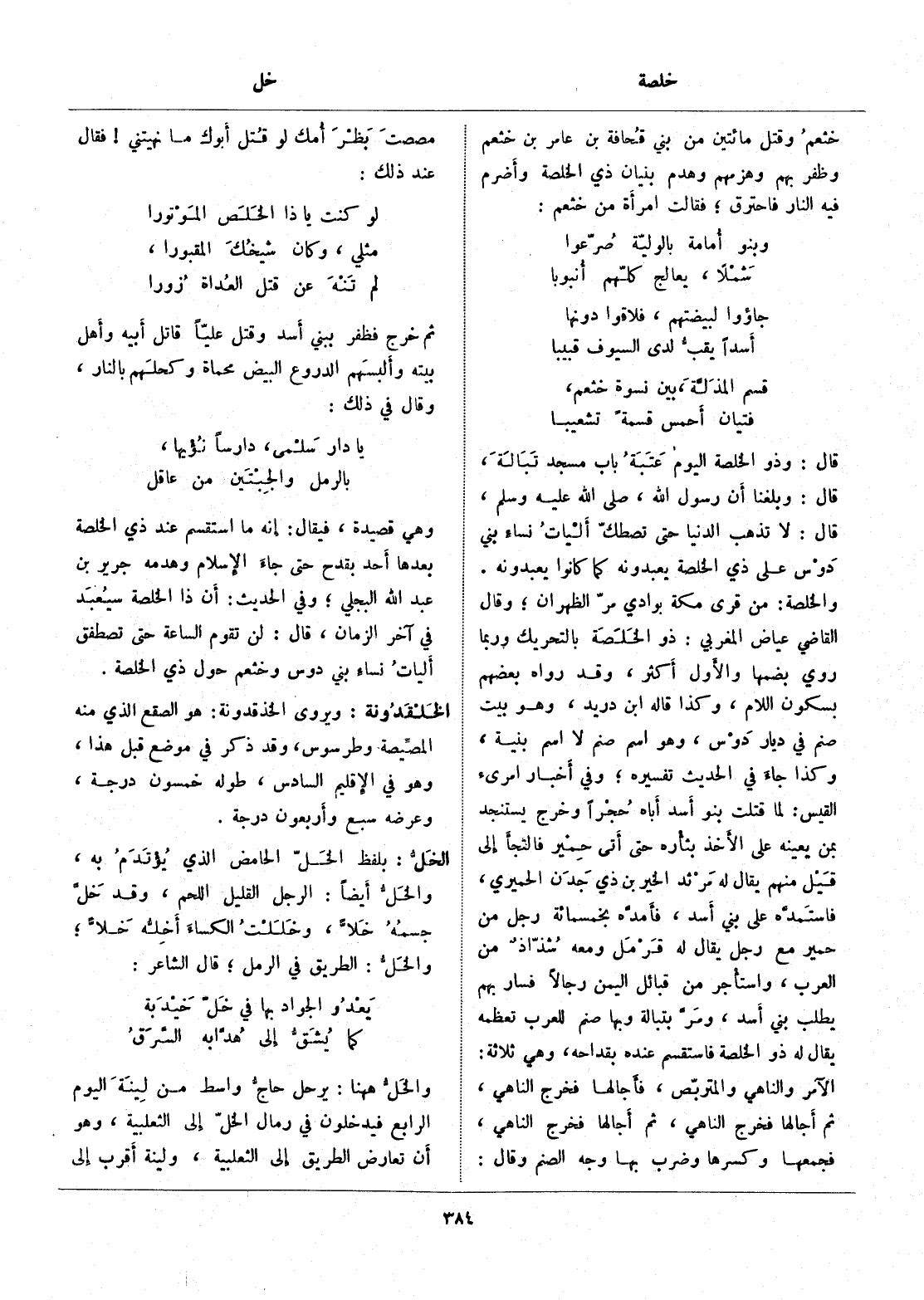 قال: وذو الخلصة اليوم عتبة باب مسجد تبالة، قال: وبلغنا أن رسول الله، صلى الله عليه وسلم، قال: لا تذهب الدنيا حتى تصطكّ أليات نساء بني دوس على ذي الخلصة يعبدونه كما كانوا يعبدونه. والخلصة: من قرى مكة بوادي مرّ الظهران، وقال القاضي عياض المغربي: ذو الخلصة بالتحريك وربما روي بضمها والأول أكثر، وقد رواه بعضهم بسكون اللام، وكذا قاله ابن دريد، وهو بيت صنم في ديار دوس، وهو اسم صنم لا اسم بنية، وكذا جاء في الحديث تفسيره، وفي أخبار امرئ القيس: لما قتلت بنو أسد أباه حجرا وخرج يستنجد بمن يعينه على الأخذ بثأره حتى أتى حمير فالتجأ إلى قيل منهم يقال له مرثد الخير بن ذي جدن الحميري، فاستمدّه على بني أسد، فأمدّه بخمسمائة رجل من حمير مع رجل يقال له قرمل ومعه شذّاذ من العرب، واستأجر من قبائل اليمن رجالا فسار بهم يطلب بني أسد، ومرّ بتبالة وبها صنم للعرب تعظمه يقال له ذو الخلصة فاستقسم عنده بقداحه، وهي ثلاثة: