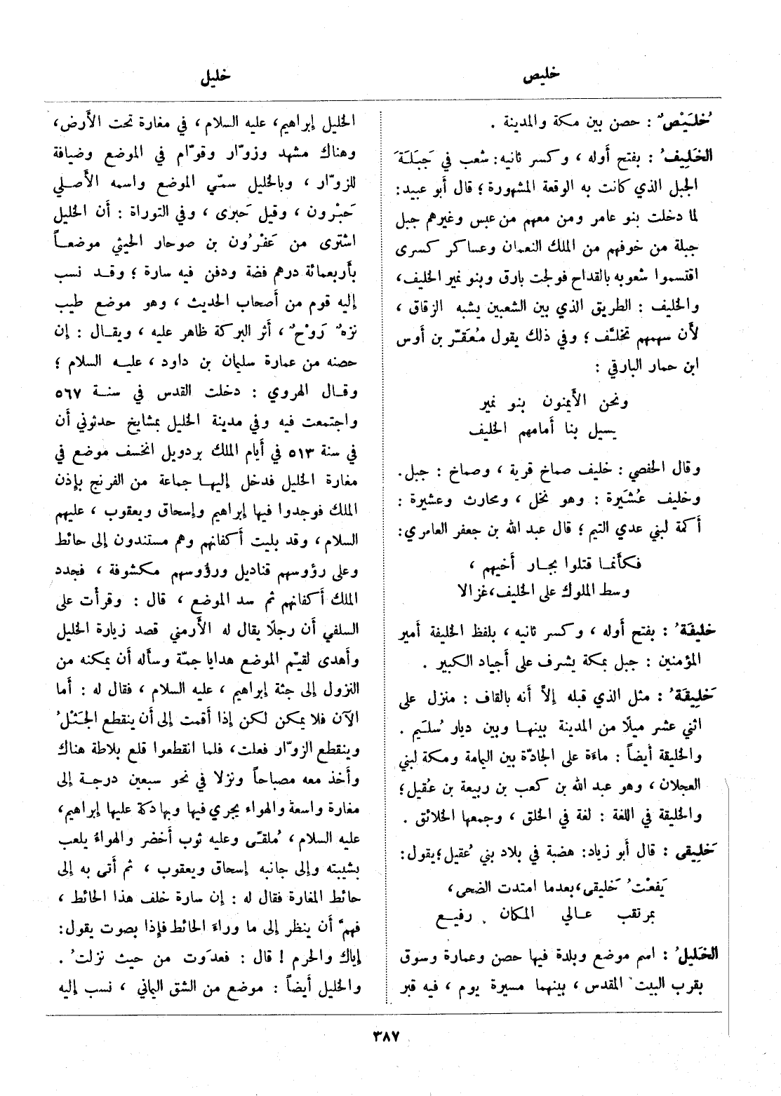 اسم موضع وبلدة فيها حصن وعمارة وسوق بقرب البيت المقدس، بينهما مسيرة يوم، فيه قبر الخليل إبراهيم، عليه السلام، في مغارة تحت الأرض، وهناك مشهد وزوّار وقوّام في الموضع وضيافة للزوّار، وبالخليل سمّي الموضع واسمه الأصلي حبرون، وقيل حبرى، وفي التوراة: أن الخليل اشترى من عفرون بن صوحار الحيثي موضعا بأربعمائة درهم فضة ودفن فيه سارة، وقد نسب إليه قوم من أصحاب الحديث، وهو موضع طيب نزه روح، أثر البركة ظاهر عليه، ويقال: إن حصنه من عمارة سليمان بن داود، عليه السلام، وقال الهروي: دخلت القدس في سنة 567 واجتمعت فيه وفي مدينة الخليل بمشايخ حدثوني أن في سنة 513 في أيام الملك بردويل انخسف موضع في مغارة الخليل فدخل إليها جماعة من الفرنج بإذن الملك فوجدوا فيها إبراهيم وإسحاق ويعقوب، عليهم السلام، وقد بليت أكفانهم وهم مستندون إلى حائط وعلى رؤوسهم قناديل ورؤوسهم مكشوفة، فجدد الملك أكفانهم ثم سد الموضع، قال: وقرأت على السلفي أن رجلا يقال له الأرمني قصد زيارة الخليل وأهدى لقيّم الموضع هدايا جمّة وسأله أن يمكنه من النزول إلى جثة إبراهيم، عليه السلام، فقال له: أما الآن فلا يمكن لكن إذا أقمت إلى أن ينقطع الجثل وينقطع الزوّار فعلت، فلما انقطعوا قلع بلاطة هناك وأخذ معه مصباحا ونزلا في نحو سبعين درجة إلى مغارة واسعة والهواء يجري فيها وبها دكة عليها إبراهيم، عليه السلام، ملقّى وعليه ثوب أخضر والهواء يلعب بشيبته وإلى جانبه إسحاق ويعقوب، ثم أتى به إلى حائط المغارة فقال له: إن سارة خلف هذا الحائط، فهمّ أن ينظر إلى ما وراء الحائط فإذا بصوت يقول: