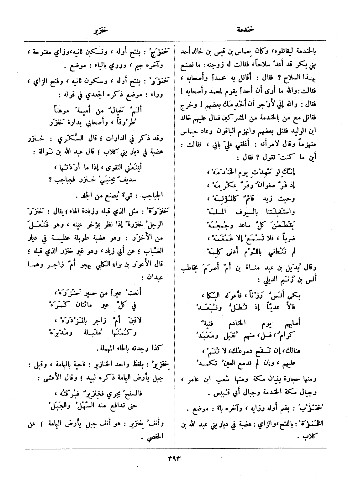 مثل الذي قبله وزيادة الهاء، يقال: خنزر الرجل خنزرة إذا نظر بمؤخر عينه، وهو فنعل من الأخزر: وهو هضبة طويلة عظيمة في ديار الضّباب، عن أبي زياد، وهو غير خنزر الذي قبله، قال الأعور بن براء الكلبي يهجو أمّ زاجر وهما عبدان: