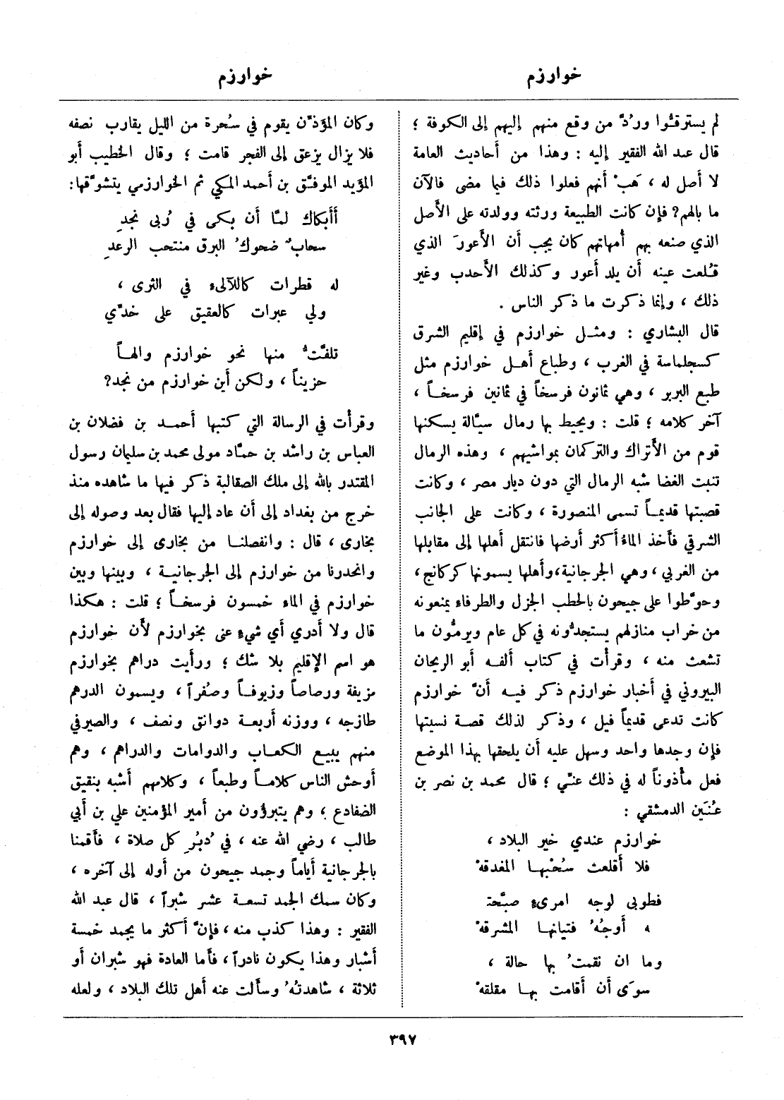 قال البشاري: ومثل خوارزم في إقليم الشرق كسجلماسة في الغرب، وطباع أهل خوارزم مثل طبع البربر، وهي ثمانون فرسخا في ثمانين فرسخا، آخر كلامه، قلت: ويحيط بها رمال سيّالة يسكنها قوم من الأتراك والتركمان بمواشيهم، وهذه الرمال تنبت الغضا شبه الرمال التي دون ديار مصر، وكانت قصبتها قديما تسمى المنصورة، وكانت على الجانب الشرقي فأخذ الماء أكثر أرضها فانتقل أهلها إلى مقابلها من الغربي، وهي الجرجانية، وأهلها يسمونها كركانج، وحوّطوا على جيحون بالحطب الجزل والطرفاء يمنعونه من خراب منازلهم يستجدّونه في كل عام ويرمّون ما تشعث منه، وقرأت في كتاب ألفه أبو الريحان البيروني في أخبار خوارزم ذكر فيه أنّ خوارزم كانت تدعى قديما فيل، وذكر لذلك قصة نسيتها فإن وجدها واحد وسهل عليه أن يلحقها بهذا الموضع فعل مأذونا له في ذلك عنّي، قال محمد بن نصر بن عنين الدمشقي: