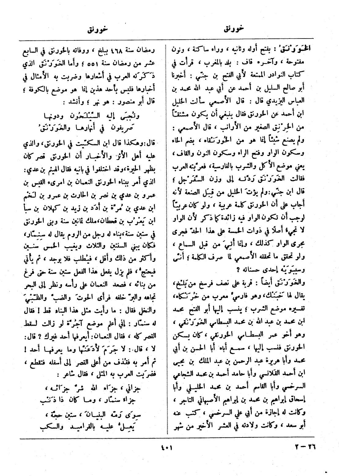 قال: وهكذا قال ابن السكّيت في الخورنق، والذي عليه أهل الأثر والأخبار أن الخورنق قصر كان بظهر الحيرة، وقد اختلفوا في بانيه فقال الهيثم بن عدي: