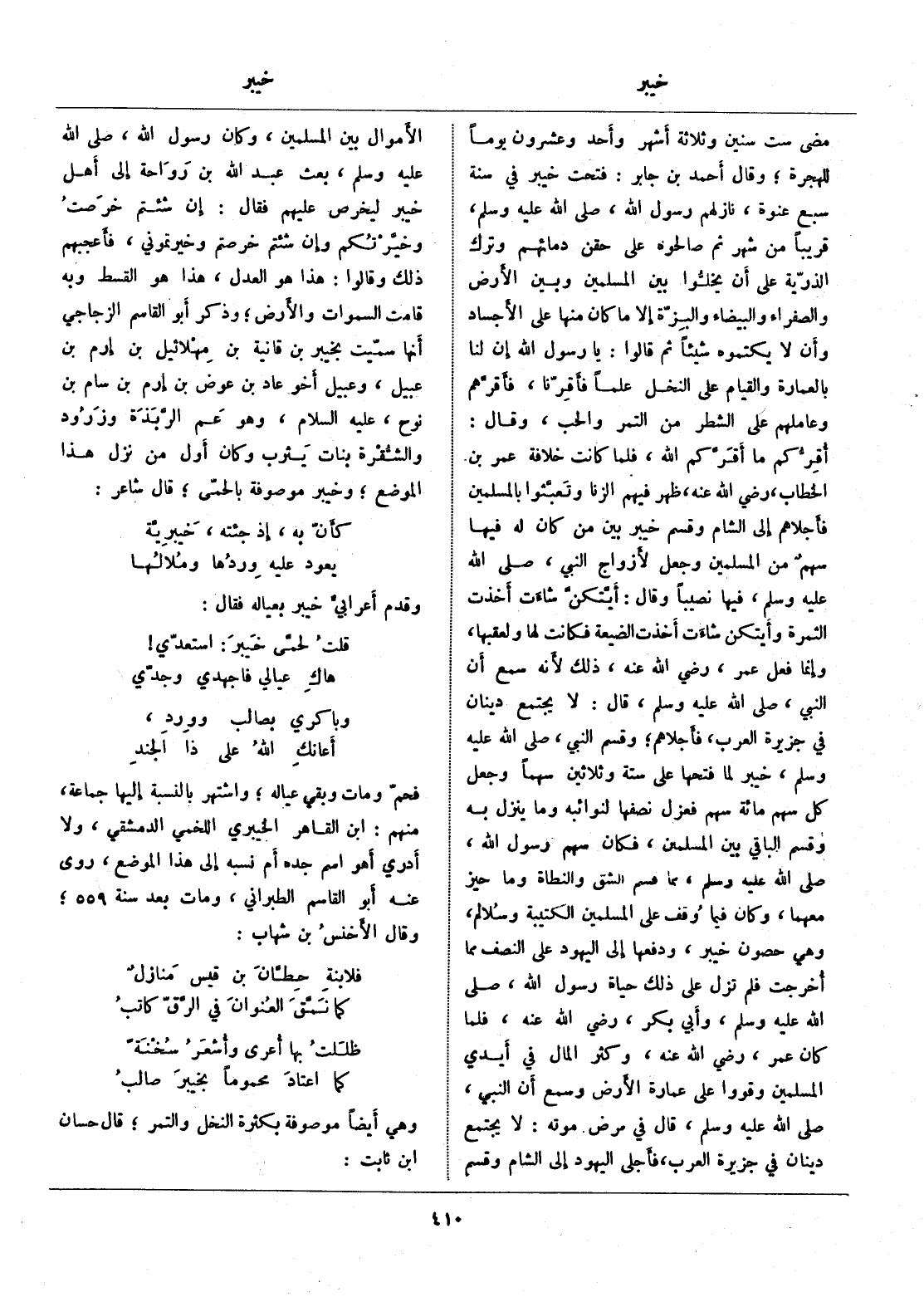 أقرّكم ما أقرّكم الله، فلما كانت خلافة عمر بن الخطاب، رضي الله عنه، ظهر فيهم الزنا وتعبّثوا بالمسلمين فأجلاهم إلى الشام وقسم خيبر بين من كان له فيها سهم من المسلمين وجعل لأزواج النبي صلى الله عليه وسلم، فيها نصيبا وقال: أيّتكنّ شاءت أخذت الثمرة وأيتكن شاءت أخذت الضيعة فكانت لها ولعقبها، وإنما فعل عمر، رضي الله عنه، ذلك لأنه سمع أن النبي، صلى الله عليه وسلم، قال: لا يجتمع دينان في جزيرة العرب، فأجلاهم، وقسم النبي، صلى الله عليه وسلم، خيبر لما فتحها على ستة وثلاثين سهما وجعل كل سهم مائة سهم فعزل نصفها لنوائبه وما ينزل به وقسم الباقي بين المسلمين، فكان سهم رسول الله، صلى الله عليه وسلم، مما قسم الشق والنطاة وما حيز معهما، وكان فيما وقف على المسلمين الكتيبة وسلالم، وهي حصون خيبر، ودفعها إلى اليهود على النصف مما أخرجت فلم تزل على ذلك حياة رسول الله، صلى الله عليه وسلم، وأبي بكر، رضي الله عنه، فلما كان عمر، رضي الله عنه، وكثر المال في أيدي المسلمين وقووا على عمارة الأرض وسمع أن النبي، صلى الله عليه وسلم، قال في مرض موته: لا يجتمع دينان في جزيرة العرب، فأجلى اليهود إلى الشام وقسم الأموال بين المسلمين، وكان رسول الله، صلى الله عليه وسلم، بعث عبد الله بن رواحة إلى أهل خيبر ليخرص عليهم فقال: إن شئتم خرصت وخيّرتكم وإن شئتم خرصتم وخيرتموني، فأعجبهم ذلك وقالوا: هذا هو العدل، هذا هو القسط وبه قامت السموات والأرض، وذكر أبو القاسم الزجاجي أنها سمّيت بخيبر بن قانية بن مهلائيل بن إرم بن عبل، وعبيل أخو عاد بن عوض بن إرم بن سام بن نوح، عليه السلام، وهو عم الرّبذة وزرود والشّقرة بنات يثرب وكان أول من نزل هذا الموضع، وخيبر موصوفة بالحمّى، قال شاعر: