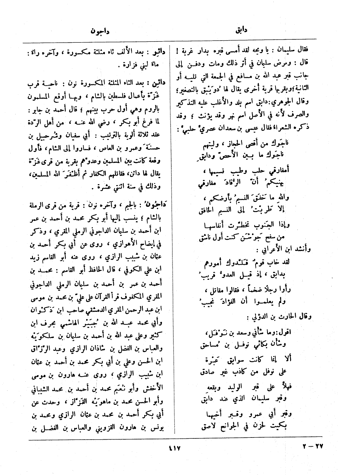 فقال سليمان: يا ويحه لقد أمسى قبره بدار غربة! قال: ومرض سليمان في أثر ذلك ومات ودفن إلى جانب قبر عبد الله بن مسافع في الجمعة التي تليه أو الثانية، وبقربها قرية أخرى يقال لها دويبق بالتصغير، وقال الجوهري: دابق اسم بلد والأغلب عليه التذكير والصرف لأنه في الأصل اسم نهر وقد يؤنث، وقد ذكره الشعراء فقال عيسى بن سعدان عصريّ حلبيّ: