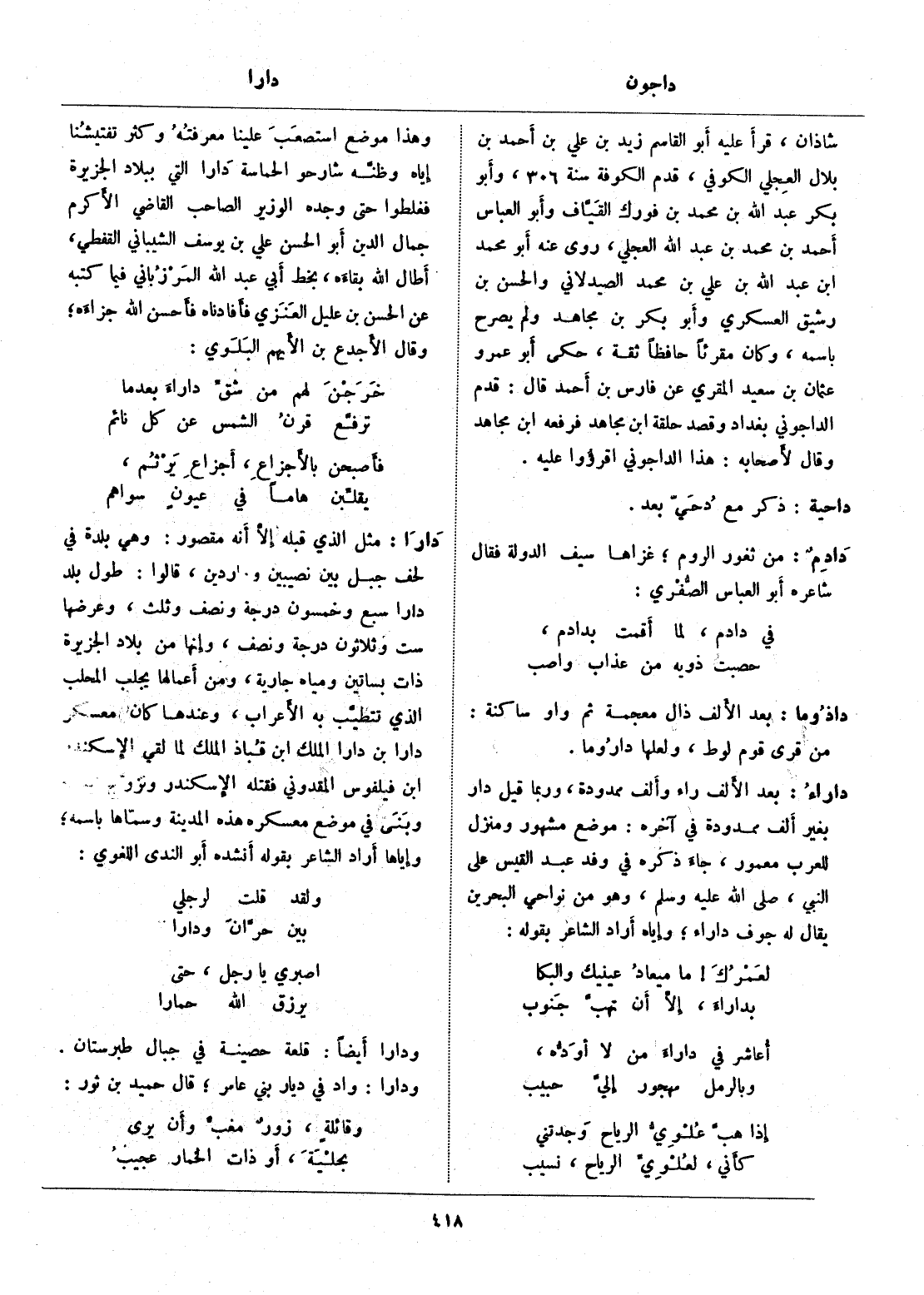 وهذا موضع استصعب علينا معرفته وكثر تفتيشنا إياه وظنّه شارحو الحماسة دارا التي ببلاد الجزيرة فغلطوا حتى وجده الوزير الصاحب القاضي الأكرم جمال الدين أبو الحسن علي بن يوسف الشيباني القفطي، أطال الله بقاءه، بخط أبي عبد الله المرزباني فيما كتبه عن الحسن بن عليل العنزي فأفادناه فأحسن الله جزاءه، وقال الأجدع بن الأيهم البلوي: