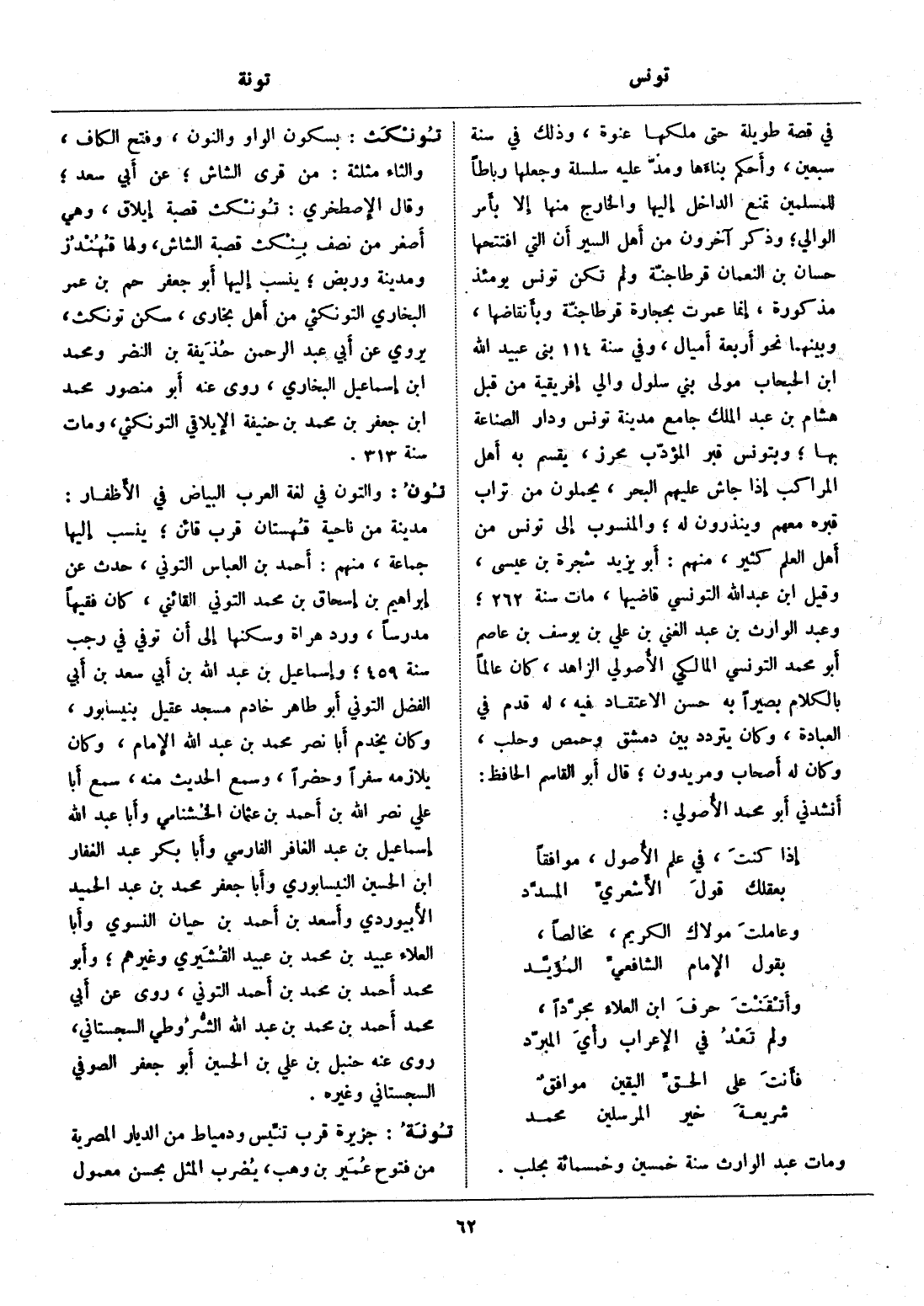في قصة طويلة حتى ملكها عنوة، وذلك في سنة سبعين، وأحكم بناءها ومدّ عليه سلسلة وجعلها رباطا للمسلمين تمنع الداخل إليها والخارج منها إلا بأمر الوالي وذكر آخرون من أهل السير أن التي افتتحها حسان بن النعمان قرطا جنّة ولم تكن تونس يومئذ مذكورة، إنما عمرت بحجارة قرطا جنّة وبأنقاضها، وبينهما نحو أربعة أميال، وفي سنة 114 بنى عبيد الله ابن الحبحاب مولى بني سلول والي إفريقية من قبل هشام بن عبد الملك جامع مدينة تونس ودار الصناعة بها وبتونس قبر المؤدّب محرز، يقسم به أهل المراكب إذا جاش عليهم البحر، يحملون من تراب قبره معهم وينذرون له والمنسوب إلى تونس من أهل العلم كثير، منهم: أبو يزيد شجرة بن عيسى، وقيل ابن عبد الله التونسي قاضيها، مات سنة 262 وعبد الوارث بن عبد الغني بن علي بن يوسف بن عاصم أبو محمد التونسي المالكي الأصولي الزاهد، كان عالما بالكلام بصيرا به حسن الاعتقاد فيه، له قدم في العبادة، وكان يتردد بين دمشق وحمص وحلب، وكان له أصحاب ومريدون قال أبو القاسم الحافظ: