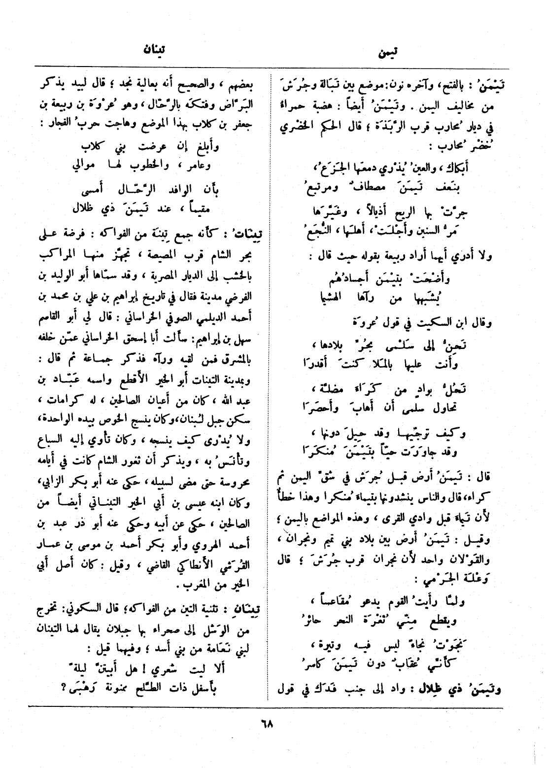 قال: تيمن أرض قبل جرش في شقّ اليمن ثم كراء، قال والناس ينشدونها بتيماء منكرا وهذا خطأ لأن تيماء قبل وادي القرى، وهذه المواضع باليمن وقيل: تيمن أرض بين بلاد بني تميم ونجران، والقولان واحد لأن نجران قرب جرش قال وعلة الجرمي: