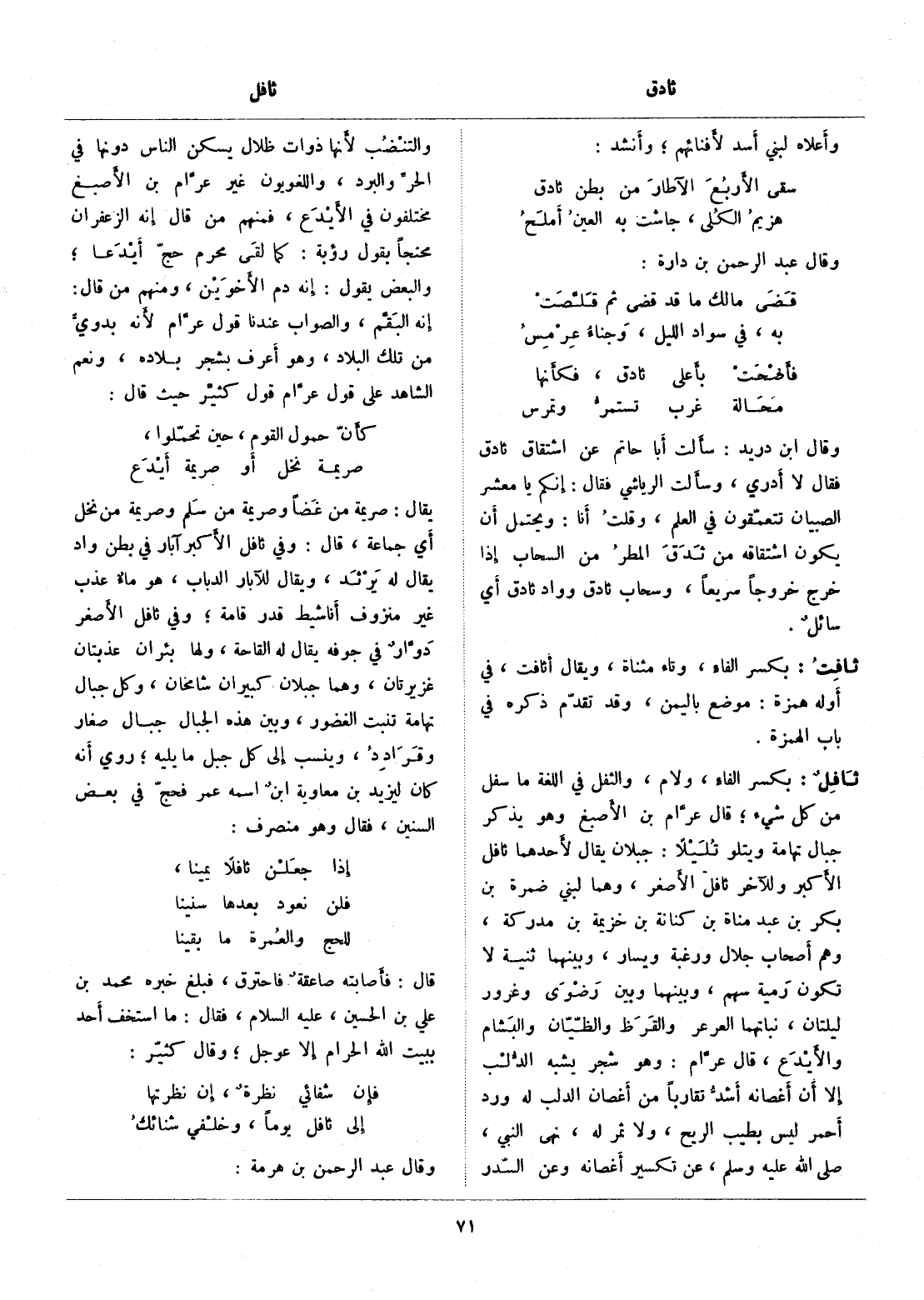 بكسر الفاء، ولام، والثفل في اللغة ما سفل من كل شيء قال عرّام بن الأصبغ وهو يذكر جبال تهامة ويتلو تليلا: جبلان يقال لأحدهما ثافل الأكبر وللآخر ثافل الأصغر، وهما لبني ضمرة بن بكر بن عبد مناة بن كنانة بن خزيمة بن مدركة، وهم أصحاب جلال ورغبة ويسار، وبينهما ثنية لا تكون رمية سهم، وبينهما وبين رضوى وغرور ليلتان، نباتهما العرعر والقرظ والظّيّان والبشام والأيدع، قال عرّام: وهو شجر يشبه الدّلب إلا أن أغصانه أشدّ تقاربا من أغصان الدلب له ورد أحمر ليس بطيب الريح، ولا ثمر له، نهى النبي، صلى الله عليه وسلم، عن تكسير أغصانه وعن السّدر والتنضب لأنها ذوات ظلال يسكن الناس دونها في الحرّ والبرد، واللغويون غير عرّام بن الأصبغ مختلفون في الأيدع، فمنهم من قال إنه الزعفران محتجا بقول رؤبة: كما لقى محرم حجّ أيدعا والبعض يقول: إنه دم الأخوين، ومنهم من قال: