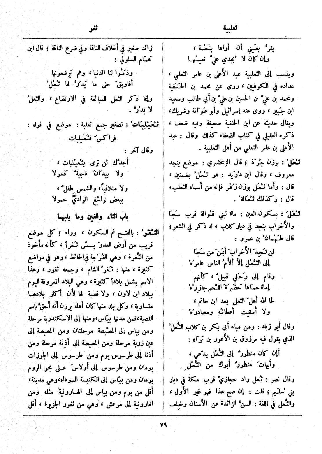 وقال نصر: ثعل واد حجازيّ قرب مكة في ديار بني سليم قلت: إن صح هذا فهو غير الأول، والثّعل في اللغة: السنّ الزائدة عن الأسنان وخلف زائد صغير في أخلاف الناقة وفي ضرع الناقة قال ابن همّام السلولي: