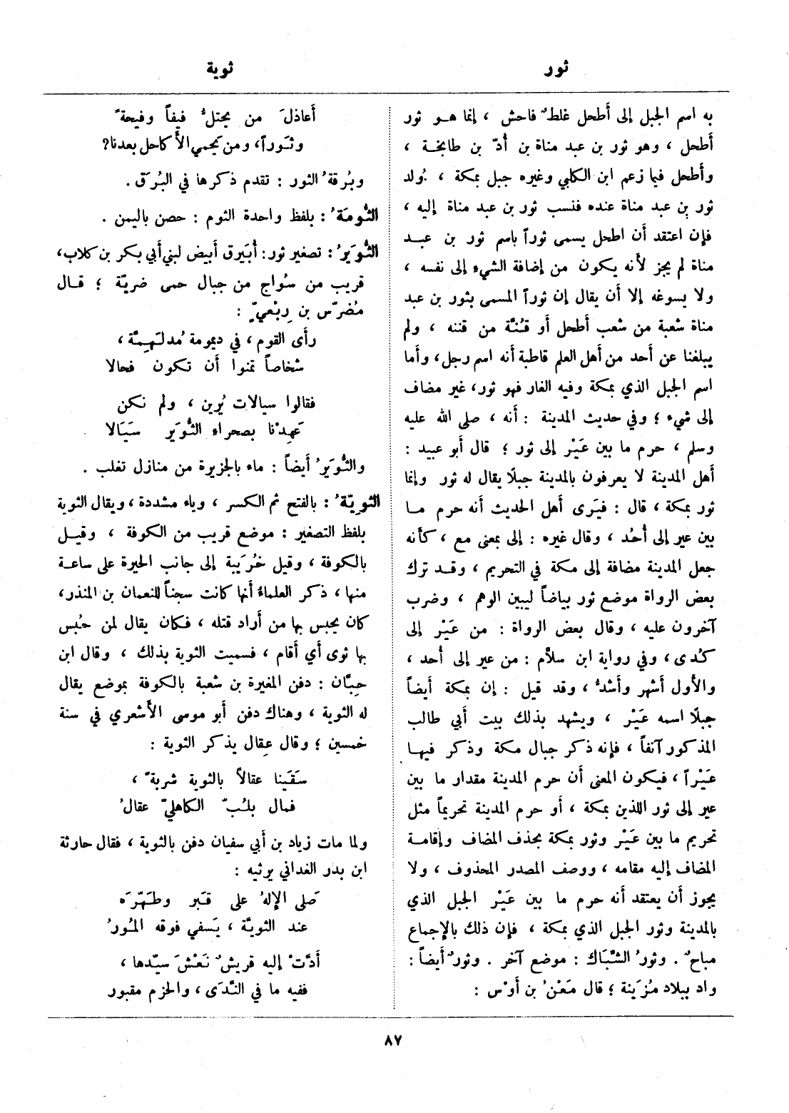 أهل المدينة لا يعرفون بالمدينة جبلا يقال له ثور وإنما ثور بمكة، قال: فيرى أهل الحديث أنه حرم ما بين عير إلى أحد، وقال غيره: إلى بمعنى مع، كأنه جعل المدينة مضافة إلى مكة في التحريم، وقد ترك بعض الرواة موضع ثور بياضا ليبين الوهم، وضرب آخرون عليه. وقال بعض الرواة: من عير إلى كدى، وفي رواية ابن سلام: من عير إلى أحد، والأول أشهر وأشدّ، وقد قيل: إن بمكة أيضا جبلا اسمه عير، ويشهد بذلك بيت أبي طالب المذكور آنفا، فإنه ذكر جبال مكة وذكر فيها عيرا، فيكون المعنى أن حرم المدينة مقدار ما بين عير إلى ثور اللذين بمكة، أو حرم المدينة تحريما مثل تحريم ما بين عير وثور بمكة بحذف المضاف وإقامة المضاف إليه مقامه، ووصف المصدر المحذوف، ولا يجوز أن يعتقد أنه حرم ما بين عير الجبل الذي بالمدينة وثور الجبل الذي بمكة، فإن ذلك بالإجماع مباح. وثور الشّباك: موضع آخر. وثور أيضا: