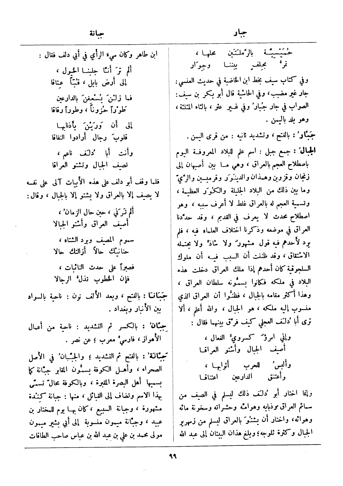 جمع جبل: اسم علم للبلاد المعروفة اليوم باصطلاح العجم بالعراق، وهي ما بين أصبهان إلى زنجان وقزوين وهمذان والدينور وقرميسين والرّيّ وما بين ذلك من البلاد الجليلة والكور العظيمة، وتسمية العجم له بالعراق غلط لا أعرف سببه، وهو اصطلاح محدث لا يعرف في القديم، وقد حدّدنا العراق في موضعه وذكرنا اختلاف العلماء فيه، فلم يرد لأحدهم فيه قول مشهور ولا شاذّ ولا يحتمله الاشتقاق، وقد ظننت أن السبب فيه أن ملوك السلجوقية كان أحدهم إذا ملك العراق دخلت هذه البلاد في ملكه فكانوا يسمّونه سلطان العراق، وهذا أكثر مقامه بالجبال، فظنّوا أن العراق الذي منسوب إليه ملكه، هو الجبال، والله أعلم، ألا ترى أبا دلف العجلي كيف فرّق بينهما فقال: