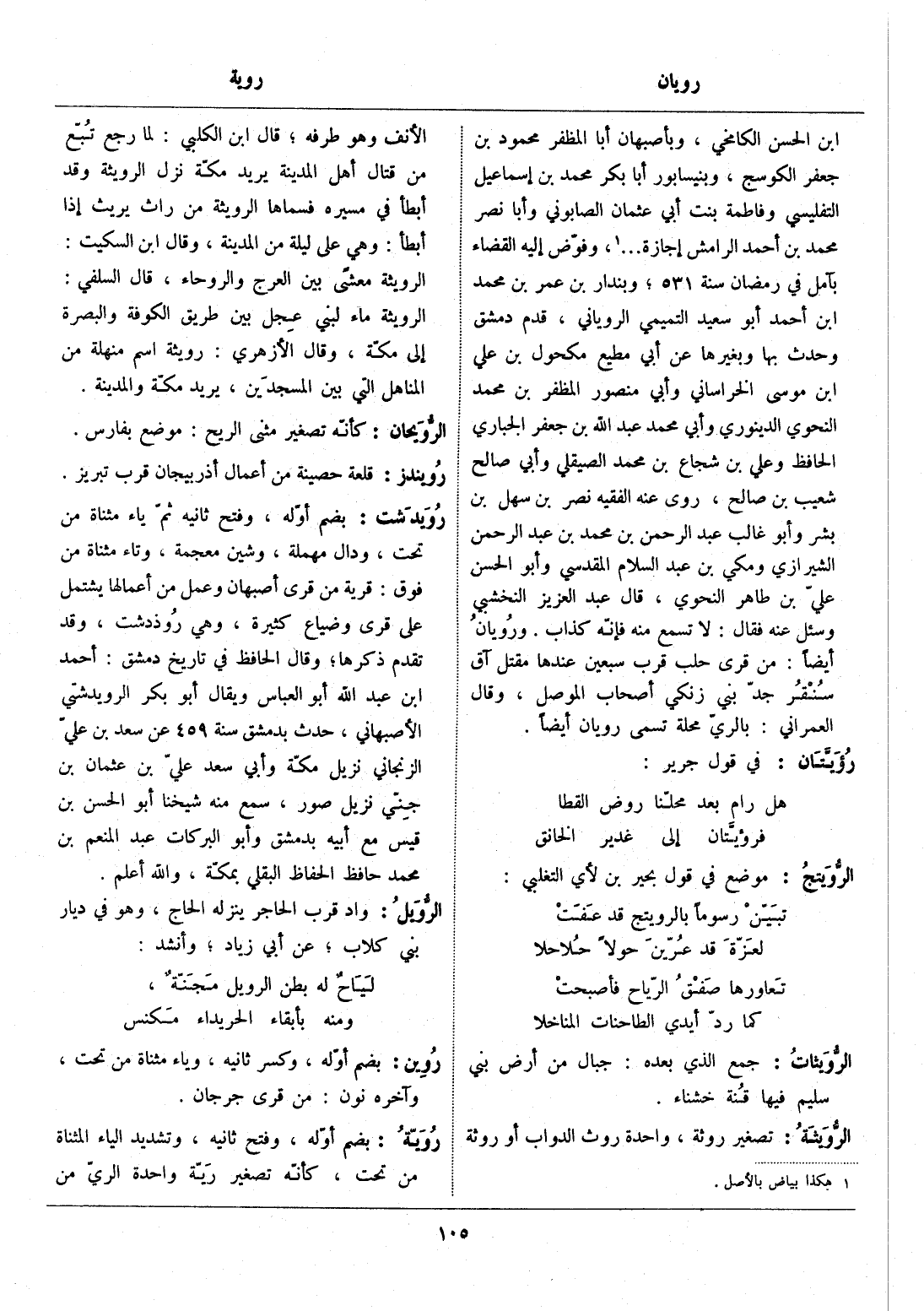 ابن الحسن الكامخي، وبأصبهان أبا المظفر محمود بن جعفر الكوسج، وبنيسابور أبا بكر محمد بن إسماعيل التفليسي وفاطمة بنت أبي عثمان الصابوني وأبا نصر محمد بن أحمد الرامش إجازة ... [1] ، وفوّض إليه القضاء بآمل في رمضان سنة 531، وبندار بن عمر بن محمد ابن أحمد أبو سعيد التميمي الروياني، قدم دمشق وحدث بها وبغيرها عن أبي مطيع مكحول بن علي ابن موسى الخراساني وأبي منصور المظفر بن محمد النحوي الدينوري وأبي محمد عبد الله بن جعفر الجباري الحافظ وعلي بن شجاع بن محمد الصيقلي وأبي صالح شعيب بن صالح، روى عنه الفقيه نصر بن سهل بن بشر وأبو غالب عبد الرحمن بن محمد بن عبد الرحمن الشيرازي ومكي بن عبد السلام المقدسي وأبو الحسن عليّ بن طاهر النحوي، قال عبد العزيز النخشبي وسئل عنه فقال: لا تسمع منه فإنّه كذاب. ورويان أيضا: من قرى حلب قرب سبعين عندها مقتل آق سنقر جدّ بني زنكي أصحاب الموصل، وقال العمراني: بالريّ محلة تسمى رويان أيضا.