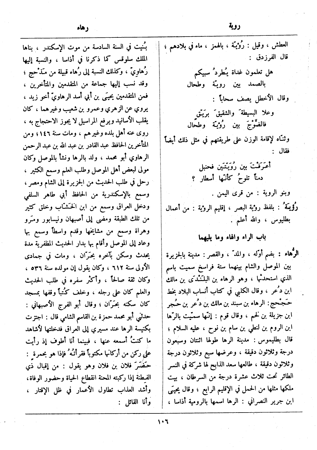 بضم أوّله، والمدّ، والقصر: مدينة بالجزيرة بين الموصل والشام بينهما ستة فراسخ سميت باسم الذي استحدثها، وهو الرهاء بن البلندى بن مالك ابن دعر، وقال الكلبي في كتاب أنساب البلاد بخط حجحج: الرهاء بن سبند بن مالك بن دعر بن حجر ابن جزيلة بن لخم، وقال قوم: إنّها سمّيت بالرّها ابن الروم بن لنطي بن سام بن نوح، عليه السلام، قال بطليموس: مدينة الرها طولها اثنتان وسبعون درجة وثلاثون دقيقة، وعرضها سبع وثلاثون درجة وثلاثون دقيقة، طالعها سعد الذابح لها شركة في النسر الطائر تحت ثلاث عشرة درجة من السرطان، بيت ملكها مثلها من الحمل في الإقليم الرابع، وقال يحيى ابن جرير النصراني: الرها اسمها بالرومية أذاسا، بنيت في السنة السادسة من موت الإسكندر، بناها الملك سلوقس كما ذكرنا في أذاسا، والنسبة إليها رهاويّ، وكذلك النسبة إلى رهاء قبيلة من مذحج، وقد نسب إليها جماعة من المتقدمين والمتأخرين، فمن المتقدمين يحيى بن أبي أسد الرهاويّ أخو زيد، يروي عن الزهري وعمرو بن شعيب وغيرهما، كان يقلب الأسانيد ويرفع المراسيل لا يجوز الاحتجاج به، روى عنه أهل بلده وغيرهم، ومات سنة 146، ومن المتأخرين الحافظ عبد القادر بن عبد الله بن عبد الرحمن الرهاوي أبو محمد، ولد بالرها ونشأ بالموصل وكان مولى لبعض أهل الموصل وطلب العلم وسمع الكثير، رحل في طلب الحديث من الجزيرة إلى الشام ومصر، وسمع بالإسكندرية من الحافظ أبي طاهر السلفي ودخل العراق وسمع من ابن الخشّاب وخلق كثير من تلك الطبقة ومضى إلى أصبهان ونيسابور ومرو وهراة وسمع من مشايخها وقدم واسطا وسمع بها وعاد إلى الموصل وأقام بها بدار الحديث المظفرية مدة يحدث وسكن بآخره بحرّان، ومات في جمادى الأولى سنة 612، وكان يقول إن مولده سنة 536، وكان ثقة صالحا، وأكثر سفره في طلب الحديث والعلم كان على رجله، وخلف كتبا وقفها بمسجد كان سكنه بحرّان، وقال أبو الفرج الأصبهاني: