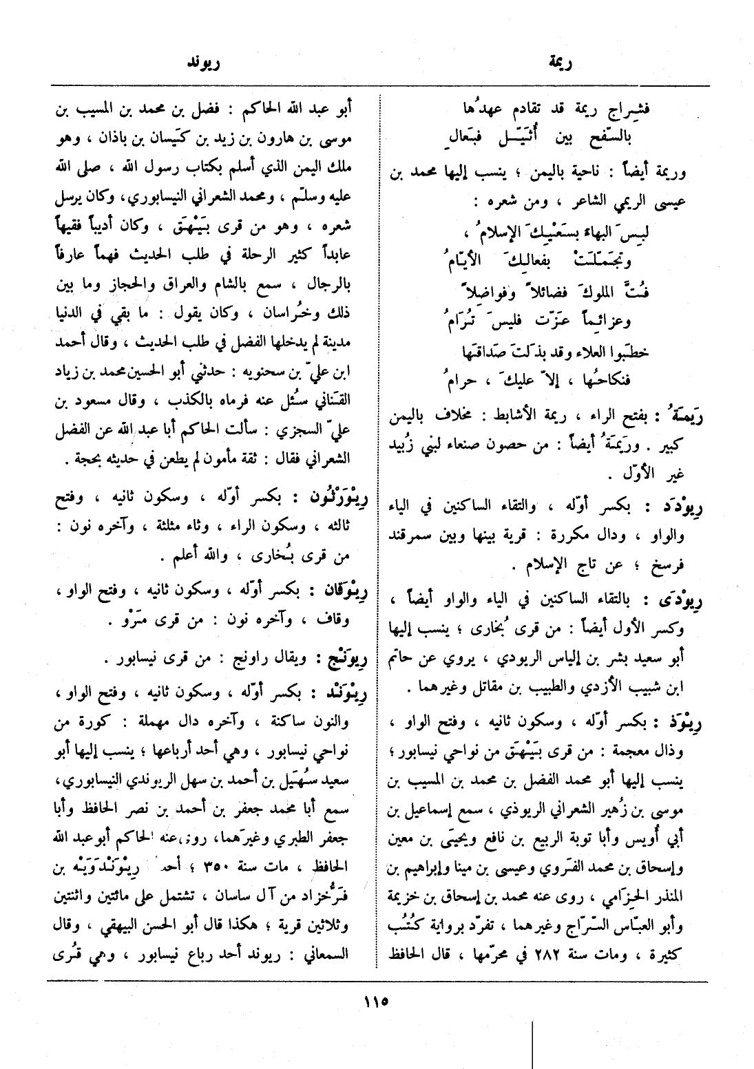 بكسر أوّله، وسكون ثانيه، وفتح الواو، وذال معجمة: من قرى بيهق من نواحي نيسابور، ينسب إليها أبو محمد الفضل بن محمد بن المسيب بن موسى بن زهير الشعراني الريوذي، سمع إسماعيل بن أبي أويس وأبا توبة الربيع بن نافع ويحيى بن معين وإسحاق بن محمد الفروي وعيسى بن مينا وإبراهيم بن المنذر الحزامي، روى عنه محمد بن إسحاق بن خزيمة وأبو العبّاس السّرّاج وغيرهما، تفرّد برواية كتب كثيرة، ومات سنة 282 في محرّمها، قال الحافظ أبو عبد الله الحاكم: فضل بن محمد بن المسيب بن موسى بن هارون بن زيد بن كيسان بن باذان، وهو ملك اليمن الذي أسلم بكتاب رسول الله، صلّى الله عليه وسلّم، ومحمد الشعراني النيسابوري، وكان يرسل شعره، وهو من قرى بيهق، وكان أديبا فقيها عابدا كثير الرحلة في طلب الحديث فهما عارفا بالرجال، سمع بالشام والعراق والحجاز وما بين ذلك وخراسان، وكان يقول: ما بقي في الدنيا مدينة لم يدخلها الفضل في طلب الحديث، وقال أحمد ابن عليّ بن سحنويه: حدثني أبو الحسين محمد بن زياد القناني سئل عنه فرماه بالكذب، وقال مسعود بن عليّ السجزي: سألت الحاكم أبا عبد الله عن الفضل الشعراني فقال: ثقة مأمون لم يطعن في حديثه بحجة.