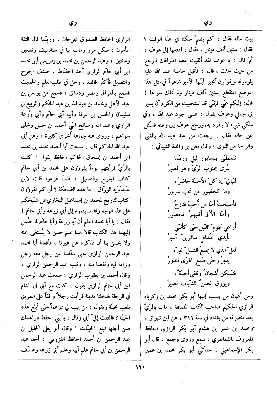 ومن أعيان من ينسب إليها أبو بكر محمد بن زكرياء الرازي الحكيم صاحب الكتب المصنفة، مات بالرّيّ بعد منصرفه من بغداد في سنة 311، عن ابن شيراز، ومحمد بن عمر بن هشام أبو بكر الرازي الحافظ المعروف بالقماطري، سمع وروى وجمع، قال أبو بكر الإسماعيلي: حدّثني أبو بكر محمد بن عمير الرازي الحافظ الصدوق بجرجان، وربّما قال الثقة المأمون، سكن مرو ومات بها في سنة نيف وتسعين ومائتين، وعبد الرحمن بن محمد بن إدريس أبو محمد ابن أبي حاتم الرازي أحد الحفّاظ، صنف الجرح والتعديل فأكثر فائدته، رحل في طلب العلم والحديث فسمع بالعراق ومصر ودمشق، فسمع من يونس بن عبد الأعلى ومحمد بن عبد الله بن عبد الحكم والربيع بن سليمان والحسن بن عرفة وأبيه أبي حاتم وأبي زرعة الرازي وعبد الله وصالح ابني أحمد بن حنبل وخلق سواهم، وروى عنه جماعة أخرى كثيرة، وعن أبي عبد الله الحاكم قال: سمعت أبا أحمد محمد بن محمد ابن أحمد بن إسحاق الحاكم الحافظ يقول: كنت بالرّيّ فرأيتهم يوما يقرؤون على محمد بن أبي حاتم كتاب الجرح والتعديل، فلمّا فرغوا قلت لابن عبدويه الورّاق: ما هذه الضحكة؟ أراكم تقرؤون كتاب التاريخ لمحمد بن إسماعيل البخاري عن شيخكم على هذا الوجه وقد نسبتموه إلى أبي زرعة وأبي حاتم! فقال: يا أبا محمد اعلم أن أبا زرعة وأبا حاتم لما حمل إليهما هذا الكتاب قالا هذا علم حسن لا يستغنى عنه ولا يحسن بنا أن نذكره عن غيرنا، فأقعدا أبا محمد عبد الرحمن الرازي حتى سألهما عن رجل معه رجل وزادا فيه ونقصا منه، ونسبه عبد الرحمن الرازي، وقال أحمد بن يعقوب الرازي: سمعت عبد الرحمن ابن أبي حاتم الرازي يقول: كنت مع أبي في الشام في الرحلة فدخلنا مدينة فرأيت رجلا واقفا على الطريق يلعب بحيّة ويقول: من يهب لي درهما حتى أبلع هذه الحيّة؟ فالتفت إليّ أبي وقال: يا بني احفظ دراهمك فمن أجلها تبلع الحيّات! وقال أبو يعلى الخليل بن عبد الرحمن بن أحمد الحافظ القزويني: أخذ عبد الرحمن بن أبي حاتم علم أبيه وعلم أبي زرعة وصنّف