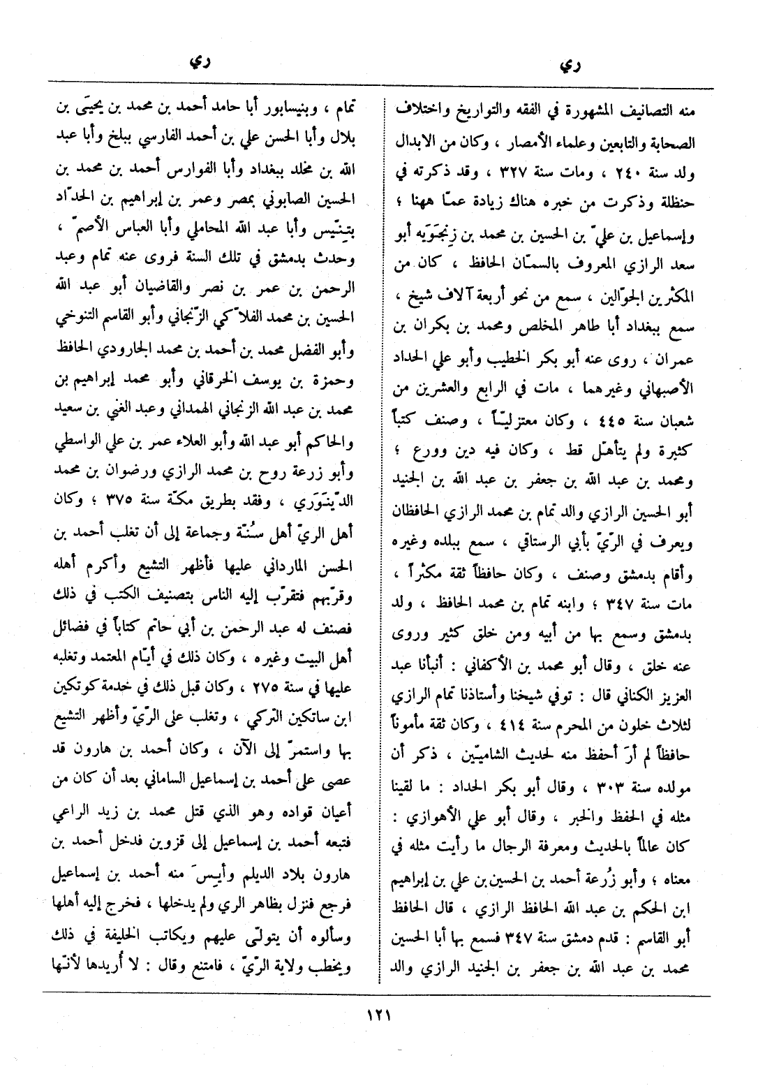 منه التصانيف المشهورة في الفقه والتواريخ واختلاف الصحابة والتابعين وعلماء الأمصار، وكان من الأبدال ولد سنة 240، ومات سنة 327، وقد ذكرته في حنظلة وذكرت من خبره هناك زيادة عمّا ههنا، وإسماعيل بن عليّ بن الحسين بن محمد بن زنجويه أبو سعد الرازي المعروف بالسمّان الحافظ، كان من المكثرين الجوّالين، سمع من نحو أربعة آلاف شيخ، سمع ببغداد أبا طاهر المخلص ومحمد بن بكران بن عمران، روى عنه أبو بكر الخطيب وأبو علي الحداد الأصبهاني وغيرهما، مات في الرابع والعشرين من شعبان سنة 445، وكان معتزليّا، وصنف كتبا كثيرة ولم يتأهّل قط، وكان فيه دين وورع، ومحمد بن عبد الله بن جعفر بن عبد الله بن الجنيد أبو الحسين الرازي والد تمام بن محمد الرازي الحافظان ويعرف في الرّيّ بأبي الرستاقي، سمع ببلده وغيره وأقام بدمشق وصنف، وكان حافظا ثقة مكثرا، مات سنة 347، وابنه تمام بن محمد الحافظ، ولد بدمشق وسمع بها من أبيه ومن خلق كثير وروى عنه خلق، وقال أبو محمد بن الأكفاني: أنبأنا عبد العزيز الكناني قال: توفي شيخنا وأستاذنا تمام الرازي لثلاث خلون من المحرم سنة 414، وكان ثقة مأمونا حافظا لم أر أحفظ منه لحديث الشاميّين، ذكر أن مولده سنة 303، وقال أبو بكر الحداد: ما لقينا مثله في الحفظ والخبر، وقال أبو علي الأهوازي: