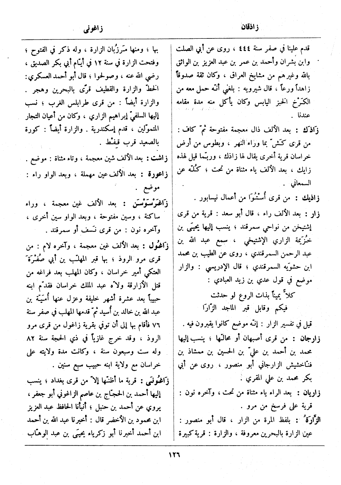 بعد الألف راء، قال أبو سعد: قرية من قرى إشتيخن من نواحي سمرقند، ينسب إليها يحيى بن خزيمة الزاري الإشتيخي، سمع عبد الله بن عبد الرحمن السمرقندي، روى عن الطيب بن محمد ابن حشوية السمرقندي، قال الإدريسي: والزار موضع في قول عدي بن زيد العبادي: