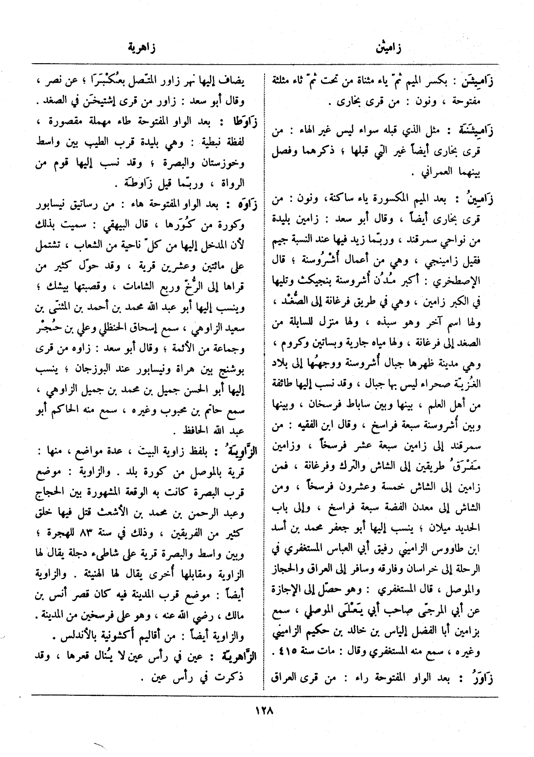 بعد الميم المكسورة ياء ساكنة، ونون: من قرى بخارى أيضا، وقال أبو سعد: زامين بليدة من نواحي سمرقند، وربّما زيد فيها عند النسبة جيم فقيل زامينجي، وهي من أعمال أشروسنة، قال الإصطخري: أكبر مدن أشروسنة بنجيكت وتليها في الكبر زامين، وهي في طريق فرغانة إلى الصّغد، ولها اسم آخر وهو سبذه، ولها منزل للسابلة من الصغد إلى فرغانة، ولها مياه جارية وبساتين وكروم، وهي مدينة ظهرها جبال أشروسنة ووجهها إلى بلاد الغزيّة صحراء ليس بها جبال، وقد نسب إليها طائفة من أهل العلم، بينها وبين ساباط فرسخان، وبينها وبين أشروسنة سبعة فراسخ، وقال ابن الفقيه: من سمرقند إلى زامين سبعة عشر فرسخا، وزامين مفرق طريقين إلى الشاش والترك وفرغانة، فمن زامين إلى الشاش خمسة وعشرون فرسخا، ومن الشاش إلى معدن الفضة سبعة فراسخ، وإلى باب الحديد ميلان، ينسب إليها أبو جعفر محمد بن أسد ابن طاووس الزاميني رفيق أبي العباس المستغفري في الرحلة إلى خراسان وفارقه وسافر إلى العراق والحجاز والموصل، قال المستغفري: وهو حصّل إلى الإجازة عن أبي المرجّى صاحب أبي يعلى الموصلي، سمع بزامين أبا الفضل إلياس بن خالد بن حكيم الزاميني وغيره، سمع منه المستغفري وقال: مات سنة 415.