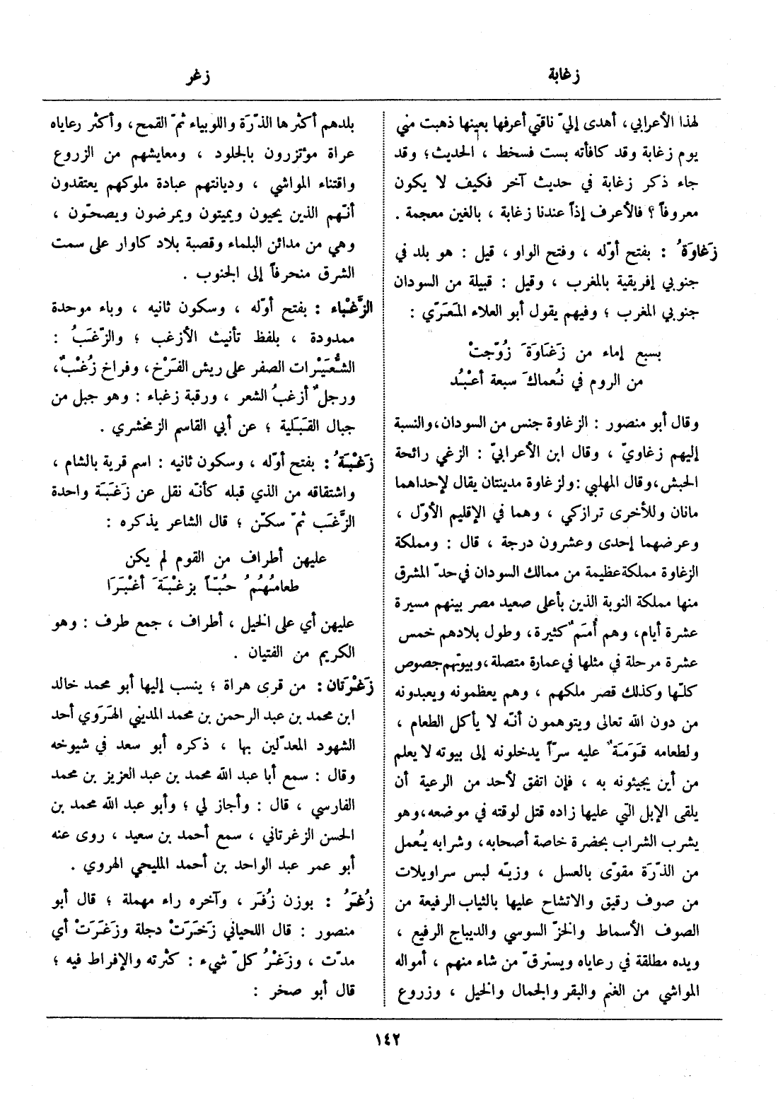 وقال أبو منصور: الزغاوة جنس من السودان، والنسبة إليهم زغاويّ، وقال ابن الأعرابيّ: الزغي رائحة الحبش، وقال المهلبي: ولزغاوة مدينتان يقال لإحداهما مانان وللأخرى ترازكي، وهما في الإقليم الأوّل، وعرضهما إحدى وعشرون درجة، قال: ومملكة الزغاوة مملكة عظيمة من ممالك السودان في حدّ المشرق منها مملكة النوبة الذين بأعلى صعيد مصر بينهم مسيرة عشرة أيام، وهم أمم كثيرة، وطول بلادهم خمس عشرة مرحلة في مثلها في عمارة متصلة، وبيوتهم جصوص كلّها وكذلك قصر ملكهم، وهم يعظمونه ويعبدونه من دون الله تعالى ويتوهمون أنّه لا يأكل الطعام، ولطعامه قومة عليه سرّا يدخلونه إلى بيوته لا يعلم من أين يجيئونه به، فإن اتفق لأحد من الرعية أن يلقى الإبل التي عليها زاده قتل لوقته في موضعه، وهو يشرب الشراب بحضرة خاصة أصحابه، وشرابه يعمل من الذّرة مقوّى بالعسل، وزيّه لبس سراويلات من صوف رقيق والاتشاح عليها بالثياب الرفيعة من الصوف الأسماط والخزّ السوسي والديباج الرفيع، ويده مطلقة في رعاياه ويسترقّ من شاء منهم، أمواله المواشي من الغنم والبقر والجمال والخيل، وزروع بلدهم أكثرها الذّرة واللوبياء ثمّ القمح، وأكثر رعاياه عراة مؤتزرون بالجلود، ومعايشهم من الزروع واقتناء المواشي، وديانتهم عبادة ملوكهم يعتقدون أنّهم الذين يحيون ويميتون ويمرضون ويصحّون، وهي من مدائن البلماء وقصبة بلاد كاوار على سمت الشرق منحرفا إلى الجنوب.