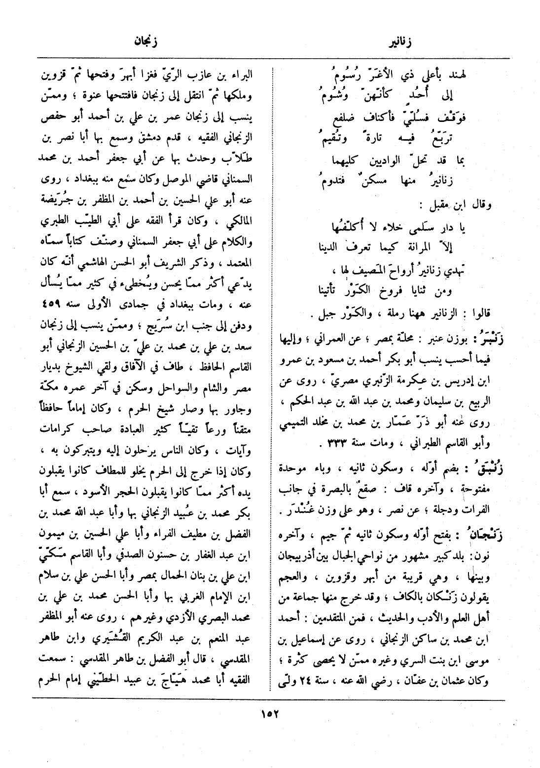 بفتح أوّله وسكون ثانيه ثمّ جيم، وآخره نون: بلد كبير مشهور من نواحي الجبال بين أذربيجان وبينها، وهي قريبة من أبهر وقزوين، والعجم يقولون زنكان بالكاف، وقد خرج منها جماعة من أهل العلم والأدب والحديث، فمن المتقدمين: أحمد ابن محمد بن ساكن الزنجاني، روى عن إسماعيل بن موسى ابن بنت السري وغيره ممّن لا يحصى كثرة، وكان عثمان بن عفّان، رضي الله عنه، سنة 24 ولّى البراء بن عازب الرّيّ فغزا أفتحها ثمّ قزوين وملكها ثمّ انتقل إلى زنجان ففتحها عنوة، وممّن ينسب إلى زنجان عمر بن علي بن أحمد أبو حفص الزنجاني الفقيه، قدم دمشق وسمع بها أبا نصر بن طلّاب وحدث بها عن أبي جعفر أحمد بن محمد السمناني قاضي الموصل وكان سمع منه ببغداد، روى عنه أبو علي الحسين بن أحمد بن المظفر بن جريضة المالكي، وكان قرأ الفقه على أبي الطيّب الطبري والكلام على أبي جعفر السمناني وصنّف كتابا سمّاه المعتمد، وذكر الشريف أبو الحسن الهاشمي أنّه كان يدّعي أكثر ممّا يحسن ويخطئ في كثير ممّا يسأل عنه، ومات ببغداد في جمادى الأولى سنة 459 ودفن إلى جنب ابن سريج، وممّن ينسب إلى زنجان سعد بن علي بن محمد بن عليّ بن الحسين الزنجاني أبو القاسم الحافظ، طاف في الآفاق ولقي الشيوخ بديار مصر والشام والسواحل وسكن في آخر عمره مكّة وجاور بها وصار شيخ الحرم، وكان إماما حافظا متقنا ورعا تقيّا كثير العبادة صاحب كرامات وآيات، وكان الناس يرحلون إليه ويتبركون به، وكان إذا خرج إلى الحرم يخلو للمطاف كانوا يقبلون يده أكثر ممّا كانوا يقبلون الحجر الأسود، سمع أبا بكر محمد بن عبيد الزنجاني بها وأبا عبد الله محمد بن الفضل بن مطيف الفراء وأبا علي الحسين بن ميمون ابن عبد الغفار بن حسنون الصدفي وأبا القاسم مكّيّ ابن علي بن بنان الحمال بمصر وأبا الحسن علي بن سلام ابن الإمام الغربي بها وأبا الحسن محمد بن علي بن محمد البصري الأزدي وغيرهم، روى عنه أبو المظفر عبد المنعم بن عبد الكريم القشيري وابن طاهر المقدسي، قال أبو الفضل بن طاهر المقدسي: سمعت الفقيه أبا محمد هيّاج بن عبيد الحطّيني إمام الحرم