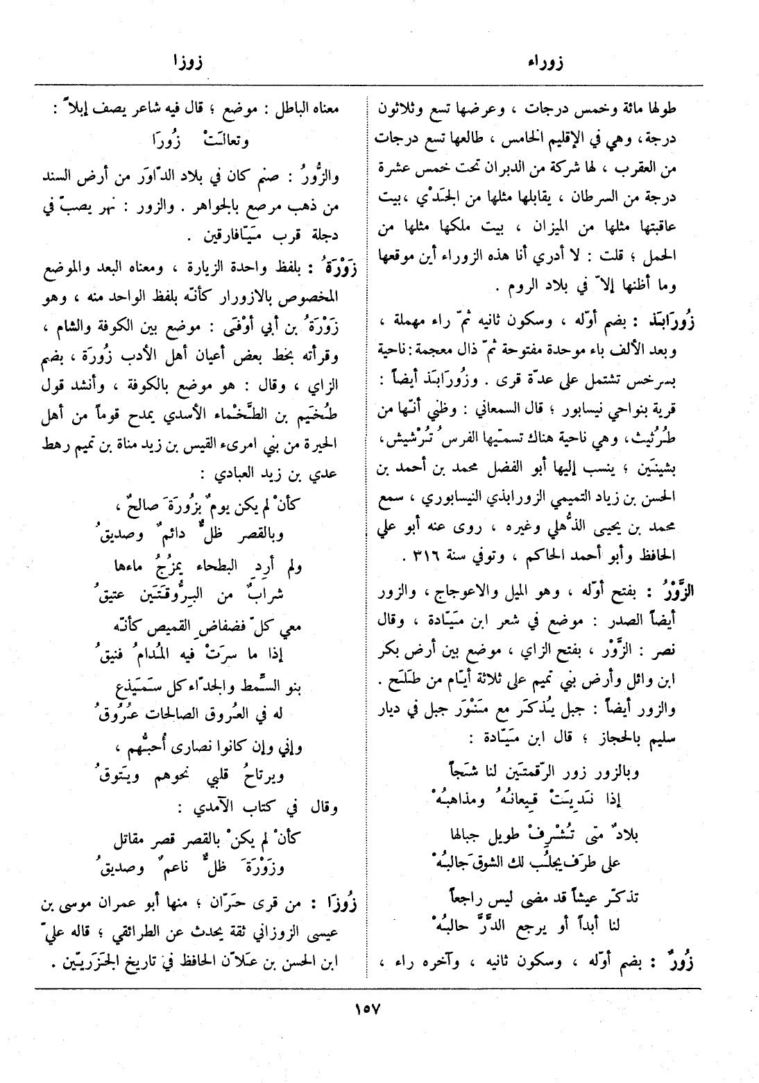 بلفظ واحدة الزيارة، ومعناه البعد والموضع المخصوص بالازورار كأنّه بلفظ الواحد منه، وهو زورة بن أبي أوفى: موضع بين الكوفة والشام، وقرأته بخط بعض أعيان أهل الأدب زورة، بضم الزاي، وقال: هو موضع بالكوفة، وأنشد قول طخيم بن الطّخماء الأسدي يمدح قوما من أهل الحيرة من بني امرئ القيس بن زيد مناة بن تميم رهط عدي بن زيد العبادي: