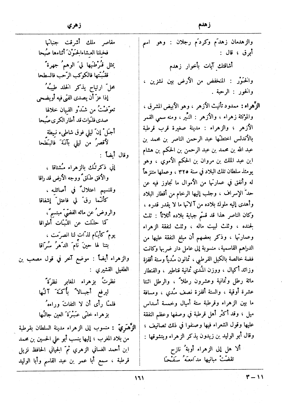 ممدود تأنيث الأزهر، وهو الأبيض المشرق، والمؤنثة زهراء، والأزهر: النّير، ومنه سمي القمر الأزهر، والزهراء: مدينة صغيرة قرب قرطبة بالأندلس اختطّها عبد الرحمن الناصر بن محمد بن عبد الله بن محمد بن عبد الرحمن بن الحكم بن هشام ابن عبد الملك بن مروان بن الحكم الأموي، وهو يومئذ سلطان تلك البلاد في سنة 325، وعملها متنزها له وأنفق في عمارتها من الأموال ما تجاوز فيه عن حدّ الإسراف، وجلب إليها الرخام من أقطار البلاد وأهدى إليه ملوك بلاده من آلاتها ما لا يقدر قدره، وكان الناصر هذا قد قسّم جباية بلاده أثلاثا: ثلث لجنده، وثلث لبيت ماله، وثلث لنفقة الزهراء وعمارتها، وذكر بعضهم أن مبلغ النفقة عليها من الدراهم القاسمية، منسوبة إلى عامل دار ضربها وكانت فضة خالصة بالكيل القرطبي، ثمانون مديا وستة أقفزة وزائد أكيال، ووزن المدي ثمانية قناطير، والقنطار مائة رطل وثمانية وعشرون رطلا، والرطل اثنتا عشرة أوقية، والستة أقفزة نصف مدي، ومسافة ما بين الزهراء وقرطبة ستة أميال وخمسة أسداس ميل، وقد أكثر أهل قرطبة في وصفها وعظم النفقة عليها وقول الشعراء فيها وصنفوا في ذلك تصانيف، وقال أبو الوليد بن زيدون يذكر الزهراء ويتشوقها: