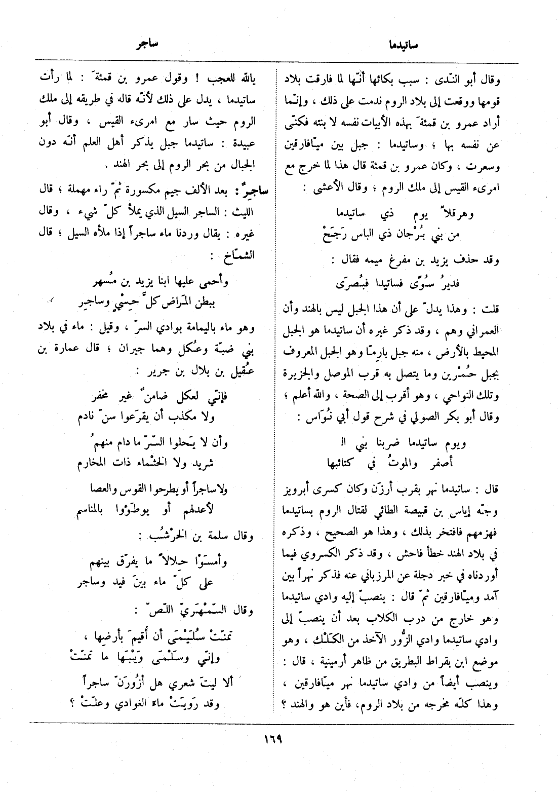 وينصب أيضا من وادي ساتيدما نهر ميّافارقين، وهذا كلّه مخرجه من بلاد الروم، فأين هو والهند؟ يا لله للعجب! وقول عمرو بن قمئة: لما رأت ساتيدما، يدل على ذلك لأنّه قاله في طريقه إلى ملك الروم حيث سار مع امرئ القيس، وقال أبو عبيدة: ساتيدما جبل يذكر أهل العلم أنّه دون الجبال من بحر الروم إلى بحر الهند.