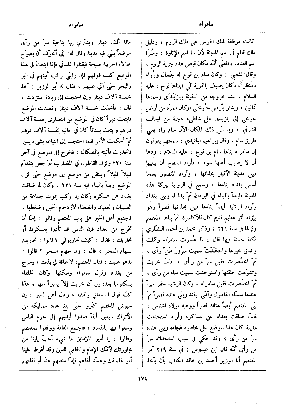 ندعو عليك، فقال المعتصم: لا طاقة لي بذلك، وخرج من بغداد ونزل سامراء وسكنها وكان الخلفاء يسكنونها بعده إلى أن خربت إلّا يسيرا منها، هذا كلّه قول السمعاني ولفظه، وقال أهل السير: إن جيوش المعتصم كثروا حتى بلغ عدد مماليكه من الأتراك سبعين ألفا فمدوا أيديهم إلى حرم الناس وسعوا فيها بالفساد، فاجتمع العامة ووقفوا للمعتصم وقالوا: يا أمير المؤمنين ما شيء أحبّ إلينا من مجاورتك لأنّك الإمام والحامي للدين وقد أفرط علينا أمر غلمانك وعمّنا أذاهم فإمّا منعتهم عنّا أو نقلتهم