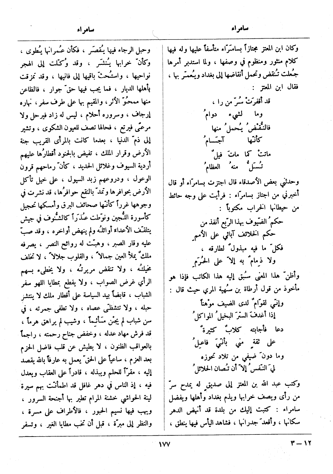 وكتب عبد الله بن المعتز إلى صديق له يمدح سرّ من رأى ويصف خرابها ويذم بغداد وأهلها ويفضل سامراء: كتبت إليك من بلدة قد أنهض الدهر سكانها، وأقعد جدرانها، فشاهد اليأس فيها ينطق، وحبل الرجاء فيها يقصر، فكأن عمرانها يطوى، وكأنّ خرابها ينشر، وقد وكّلت إلى الهجر نواحيها، واستحثّ باقيها إلى فانيها، وقد تمزقت بأهلها الديار، فما يجب فيها حقّ جوار، فالظاعن منها ممحوّ الأثر، والمقيم بها على طرف سفر، نهاره إرجاف، وسروره أحلام، ليس له زاد فيرحل ولا مرعى فيرتع، فحالها تصف للعيون الشكوى، وتشير إلى ذمّ الدنيا، بعد ما كانت بالمرأى القريب جنة الأرض وقرار الملك، تفيض بالجنود أقطارها عليهم أردية السيوف وغلائل الحديد، كأنّ رماحهم قرون الوعول، ودروعهم زبد السيول، على خيل تأكل الأرض بحوافرها وتمدّ بالنقع حوافرها، قد نشرت في وجوهها غررا كأنّها صحائف البرق وأمسكها تحجيل كأسورة اللّجين ونوّطت عذرا كالشّنوف في جيش يتلقّف الأعداء أوائله ولم ينهض أواخره، وقد صبّ عليه وقار الصبر، وهبّت له روائح النصر، يصرفه ملك يملأ العين جمالا، والقلوب جلالا، لا تخلف مخيلته، ولا تنقض مريرته، ولا يخطئ بسهم الرأي غرض الصواب، ولا يقطع بمطايا اللهو سفر الشباب، قابضا بيد السياسة على أقطار ملك لا ينتشر حبله، ولا تتشظّى عصاه، ولا تطفى جمرته، في سن شباب لم يجن مأثما، وشيب لم يراهق هرما، قد فرش مهاد عدله، وخفض جناح رحمته، راجما بالعواقب الظنون، لا يطيش عن قلب فاضل الحزم بعد العزم، ساعيا على الحقّ يعمل به عارفا بالله يقصد إليه، مقرّا للحلم ويبذله، قادرا على العقاب ويعدل فيه، إذ الناس في دهر غافل قد اطمأنّت بهم سيرة لينة الحواشي خشنة المرام تطير بها أجنحة السرور، ويهب فيها نسيم الحبور، فالأطراف على مسرة، والنظر إلى مبرّة، قبل أن تخب مطايا الغير، وتسفر