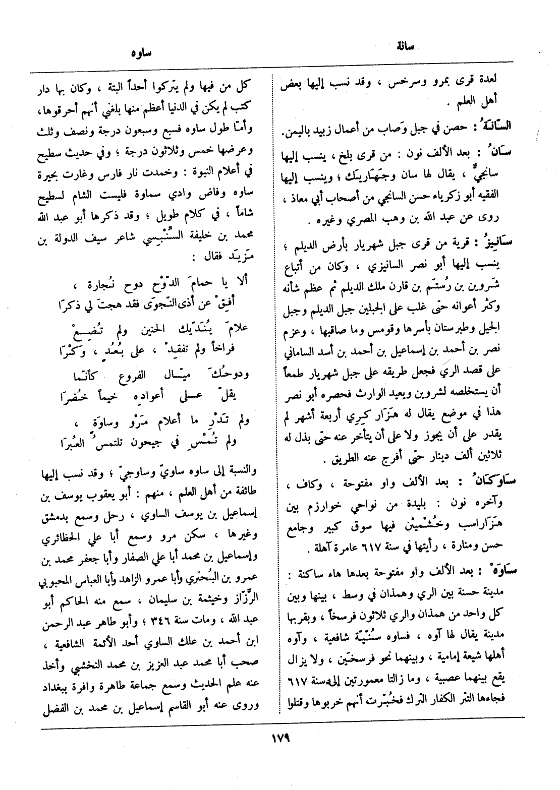 مدينة حسنة بين الري وهمذان في وسط، بينها وبين كل واحد من همذان والري ثلاثون فرسخا، وبقربها مدينة يقال لها آوه، فساوه سنّيّة شافعية، وآوه أهلها شيعة إمامية، وبينهما نحو فرسخين، ولا يزال يقع بينهما عصبية، وما زالتا معمورتين إلى سنة 617 فجاءها التتر الكفار الترك فخبّرت أنهم خربوها وقتلوا كل من فيها ولم يتركوا أحدا البتة، وكان بها دار كتب لم يكن في الدنيا أعظم منها بلغني أنهم أحرقوها، وأمّا طول ساوه فسبع وسبعون درجة ونصف وثلث وعرضها خمس وثلاثون درجة، وفي حديث سطيح في أعلام النبوة: وخمدت نار فارس وغارت بحيرة ساوه وفاض وادي سماوة فليست الشام لسطيح شاما، في كلام طويل، وقد ذكرها أبو عبد الله محمد بن خليفة السّنبسي شاعر سيف الدولة بن مزيد فقال: